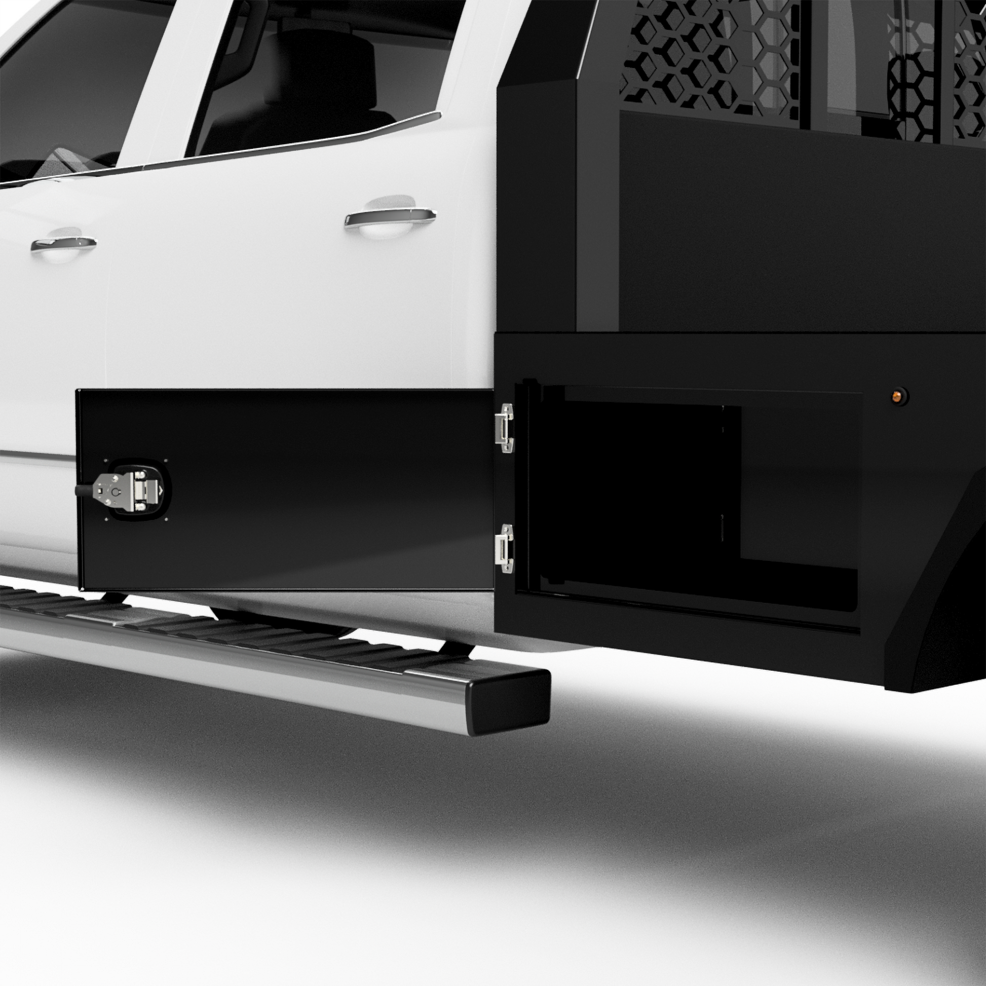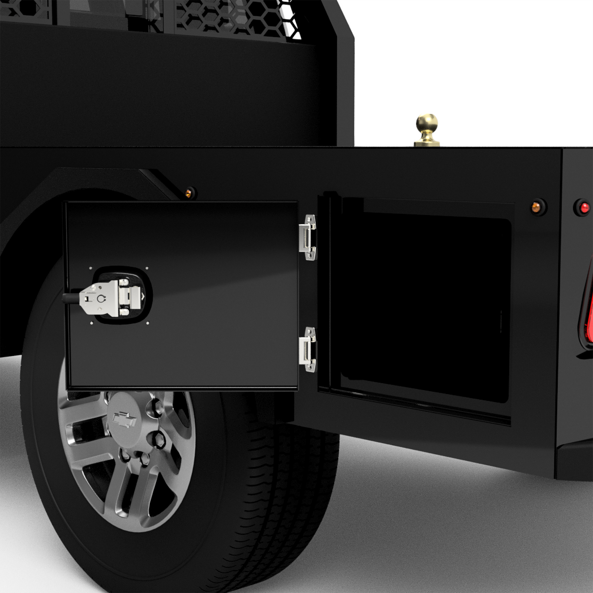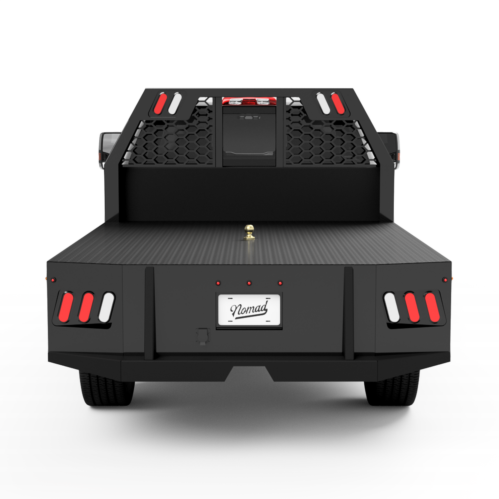 From the back of the cab-forward, this bed features a stylish headache rack and a 104"L X 80"W deck. The front 2 fender boxes are (30"L X 10"W X 16"H) and the rear 2 fender boxes are (19"L X 10"W X 16"H). The factory rear hitch can still be used with this design