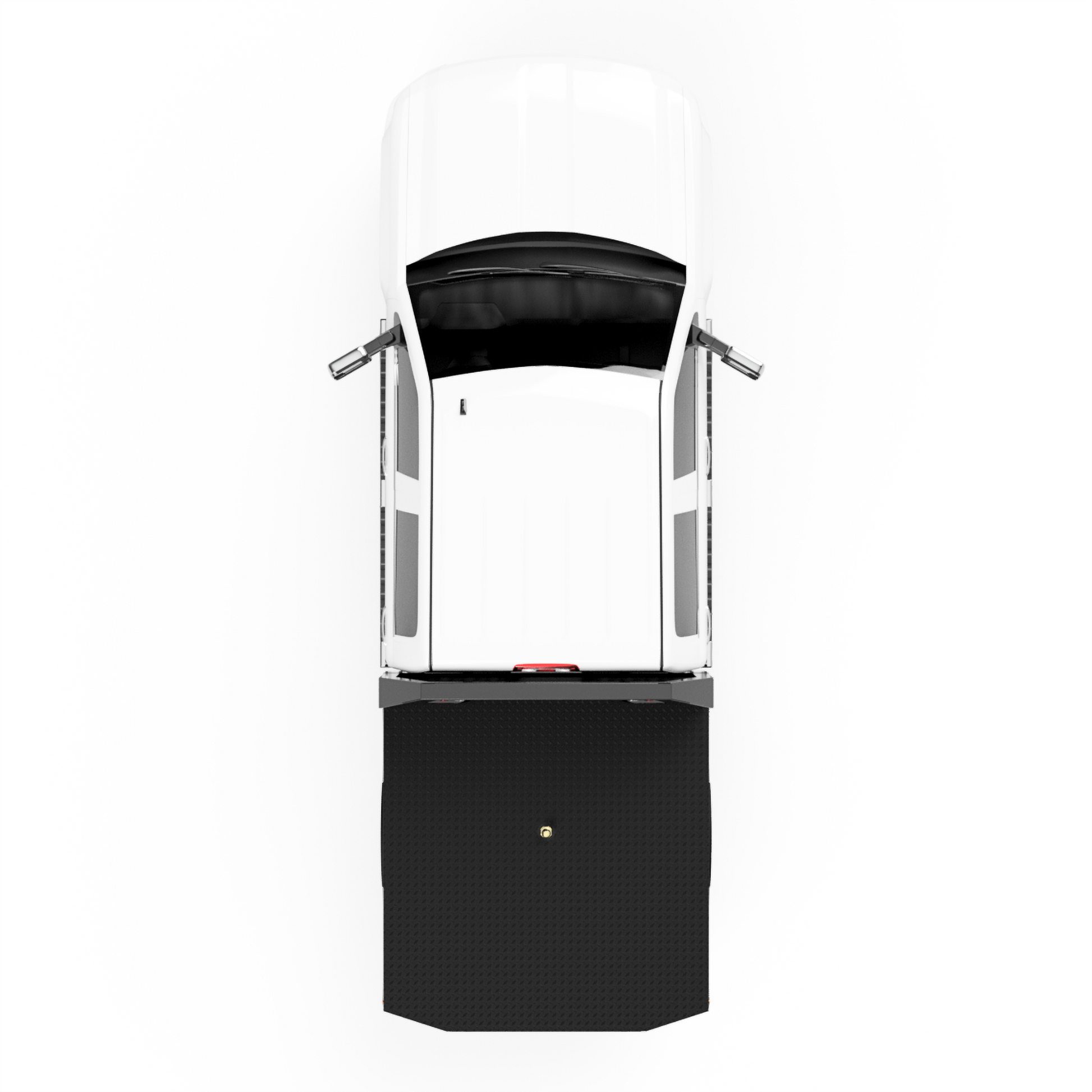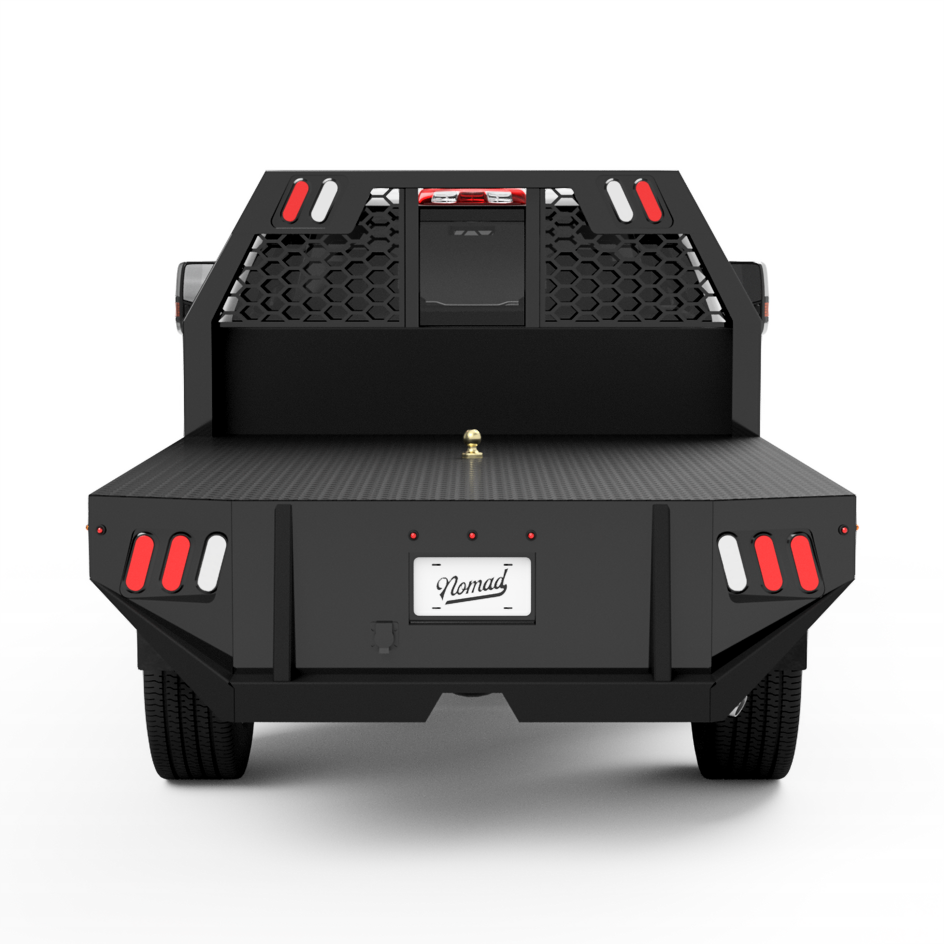 From the back of the cab-forward, this bed is pretty straight forward. It has a 88"L X 80"W deck, half-length side skirts, and a stylish-tapered tail. The factory rear hitch can still be used with this design.