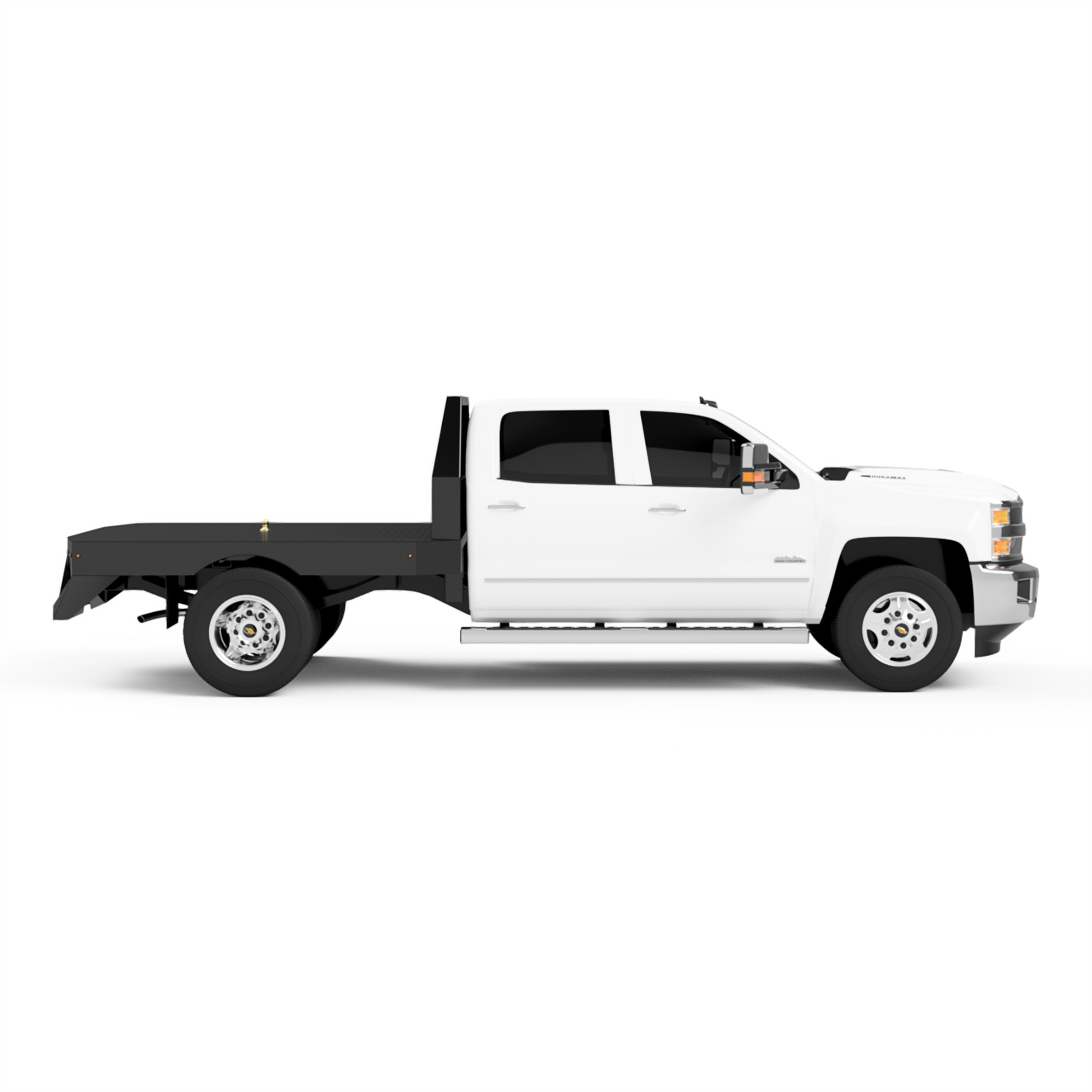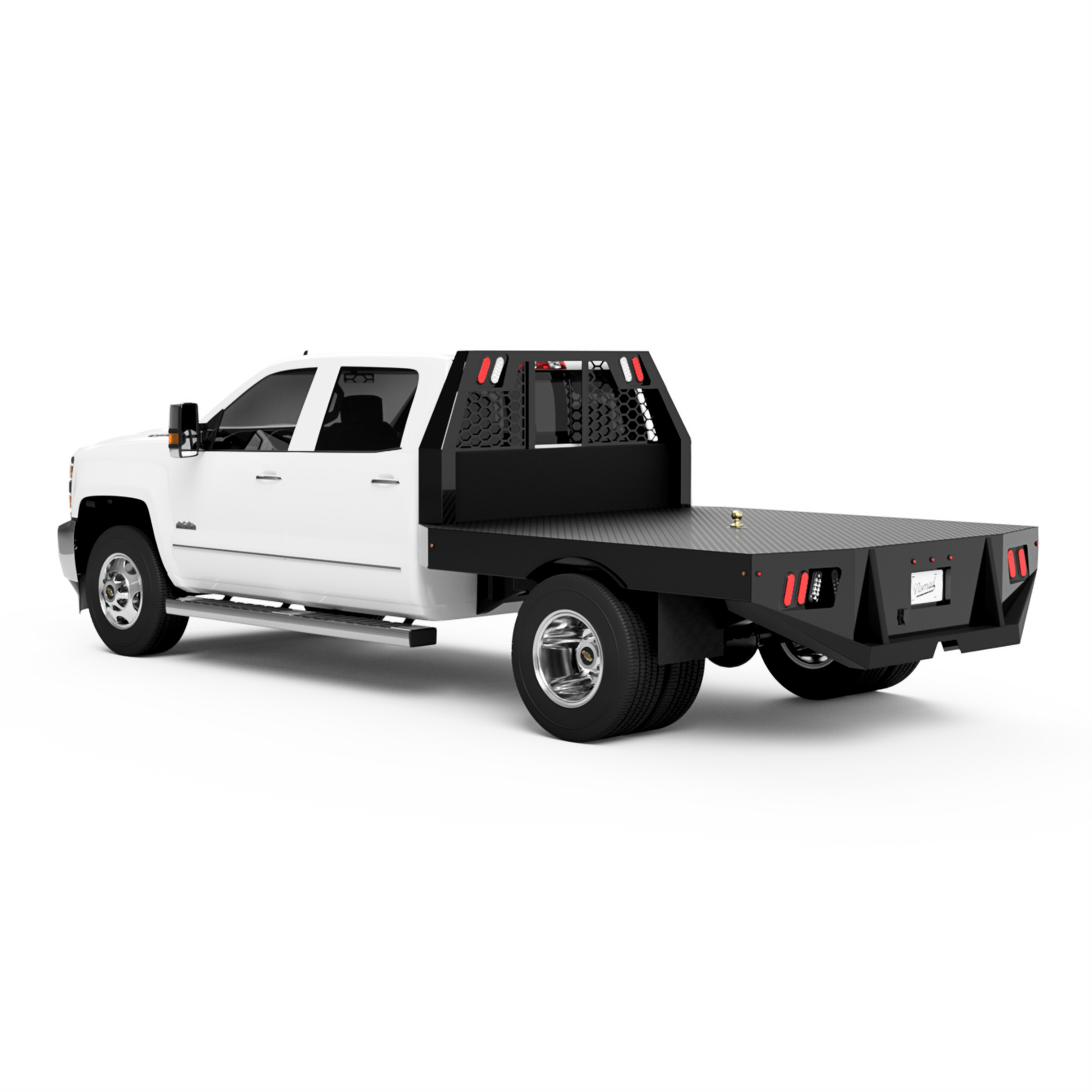 The flatbed shown above is designed to turn any 1988-2025 Chevy/GMC 3500 DRW long-bed pickup into stout and functional work horse. This bed is most notable for it's simple half-skirted construction and sleek tapered tail & headache rack designs. It's primary purpose is to help you maximize the amount of deck space & carrying capacity of your pickup.