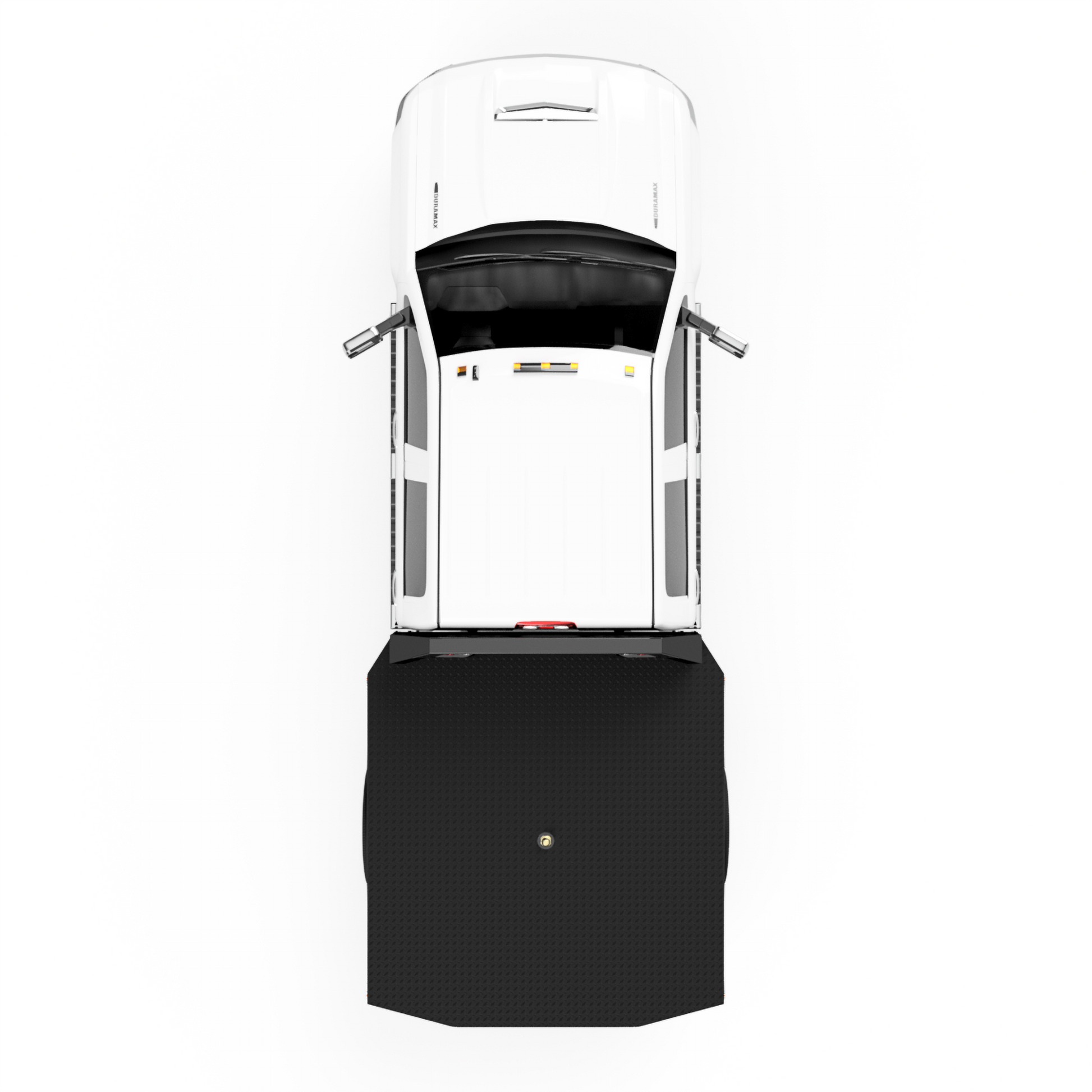 From the back of the cab-forward, this bed is pretty straight forward. It has a 104"L X 94"W deck, half-length side skirts, and a stylish-tapered tail. The factory rear hitch can still be used with this design.