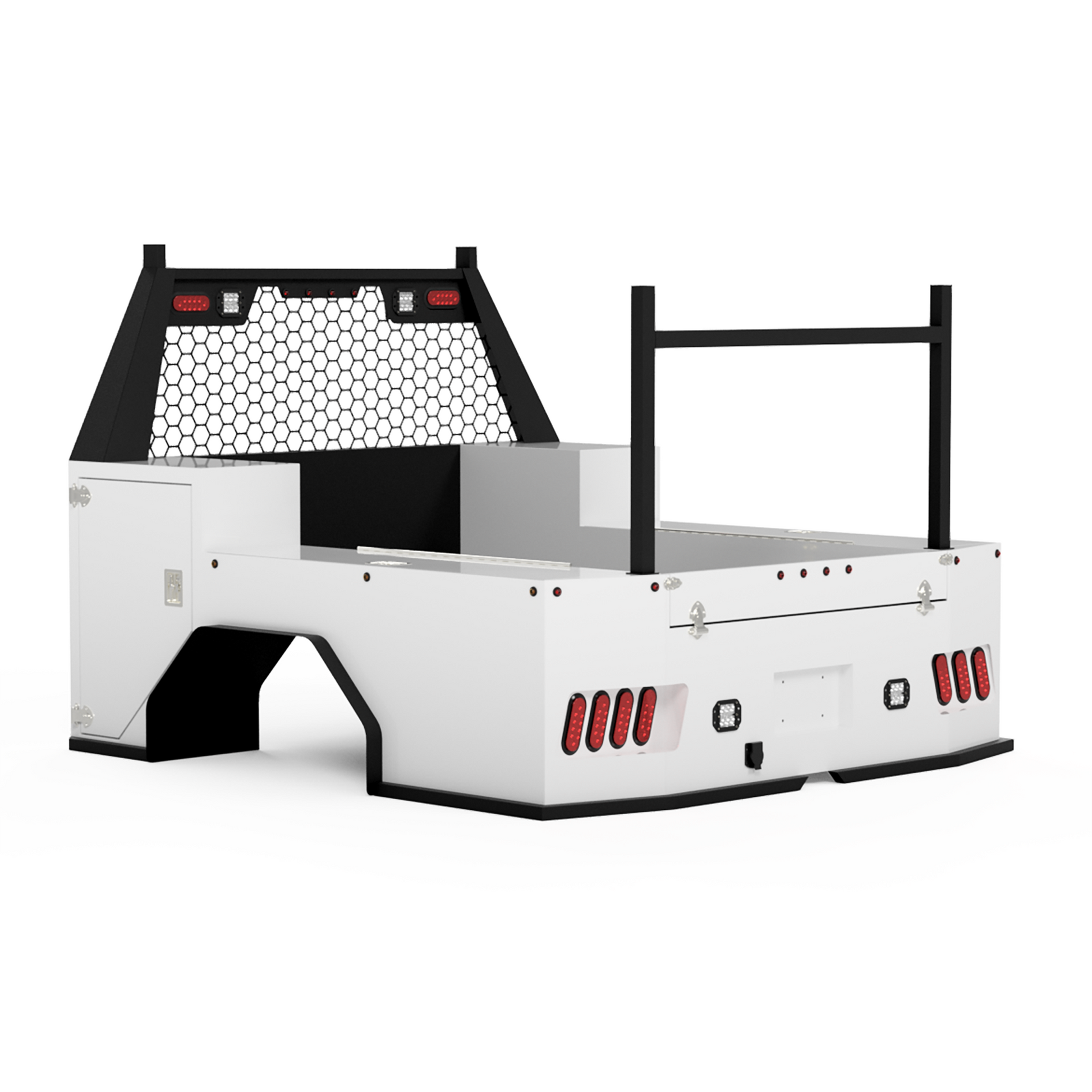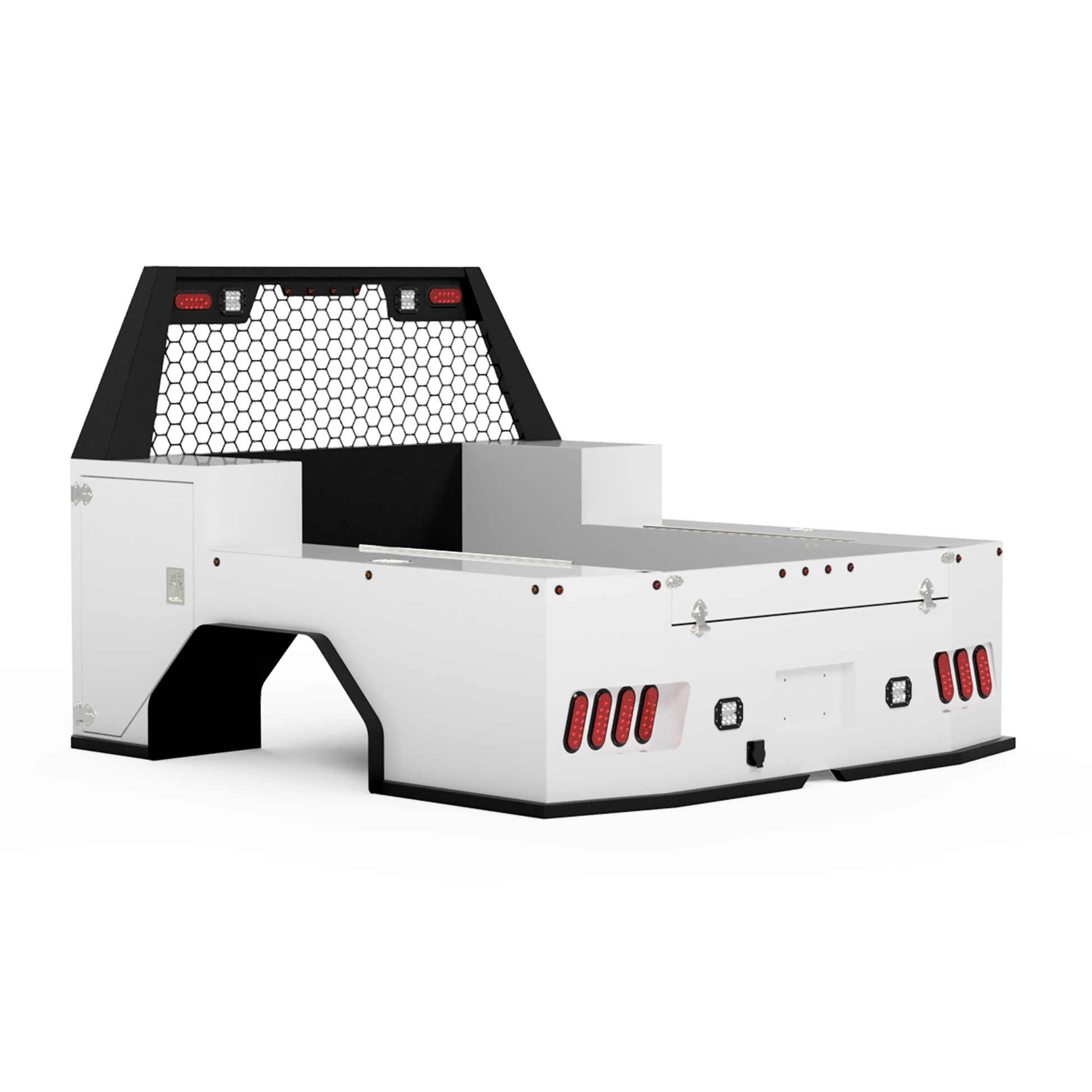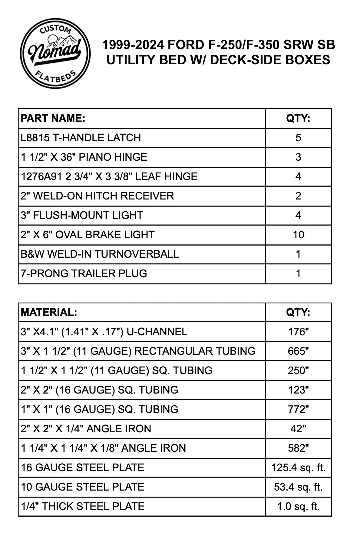 Utility bed w/ deck-side boxes designed to fit on 1999-2025 Ford F-250/F-350 SRW short-bed trucks with 38" wide frames. Built with a 3" X 4.1# U-Channel frame, 3" X 1 1/2" 11 gauge rectangular tubing sub-frame, 16 gauge plate boxes & fenders, and 10 gauge plate deck & tail. Overall dimensions: 88" long X 80" wide.
