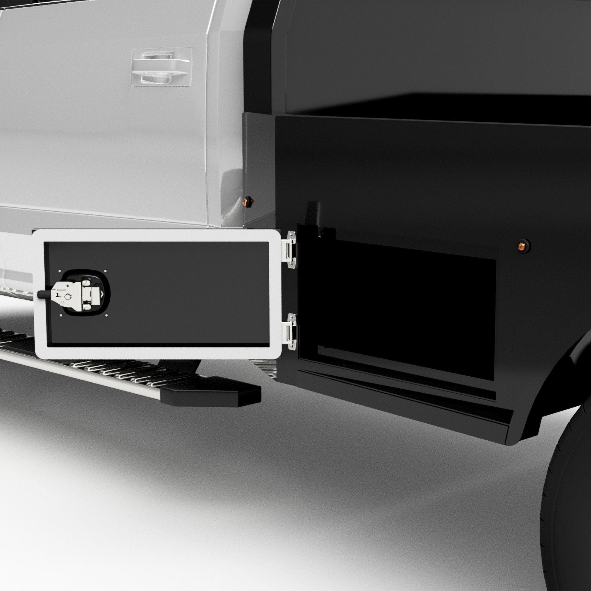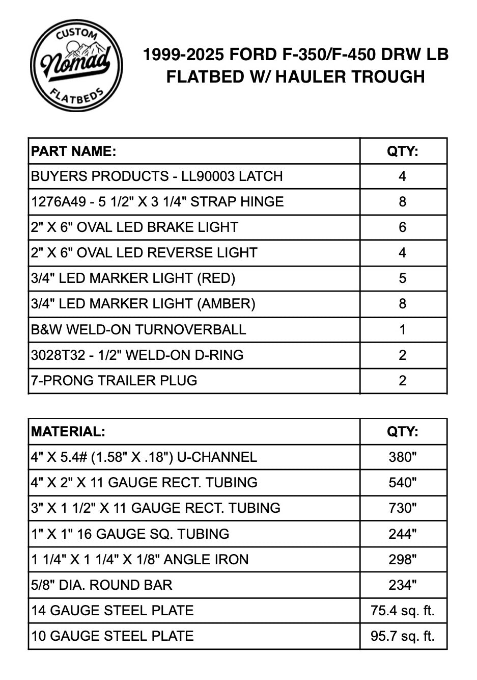 Flatbed w/ a hauler trough designed to fit on 1999-2025 Ford F-350/F-450 DRW long-bed pickups with 38" wide frames. Built with a 4" X 5.4# U-channel frame, 4" X 2" 11 gauge rectangular tubing sub-frame, 14 gauge plate boxes & fenders, and 10 gauge plate tail & deck. Overall dimensions: 104" long X 90" wide.