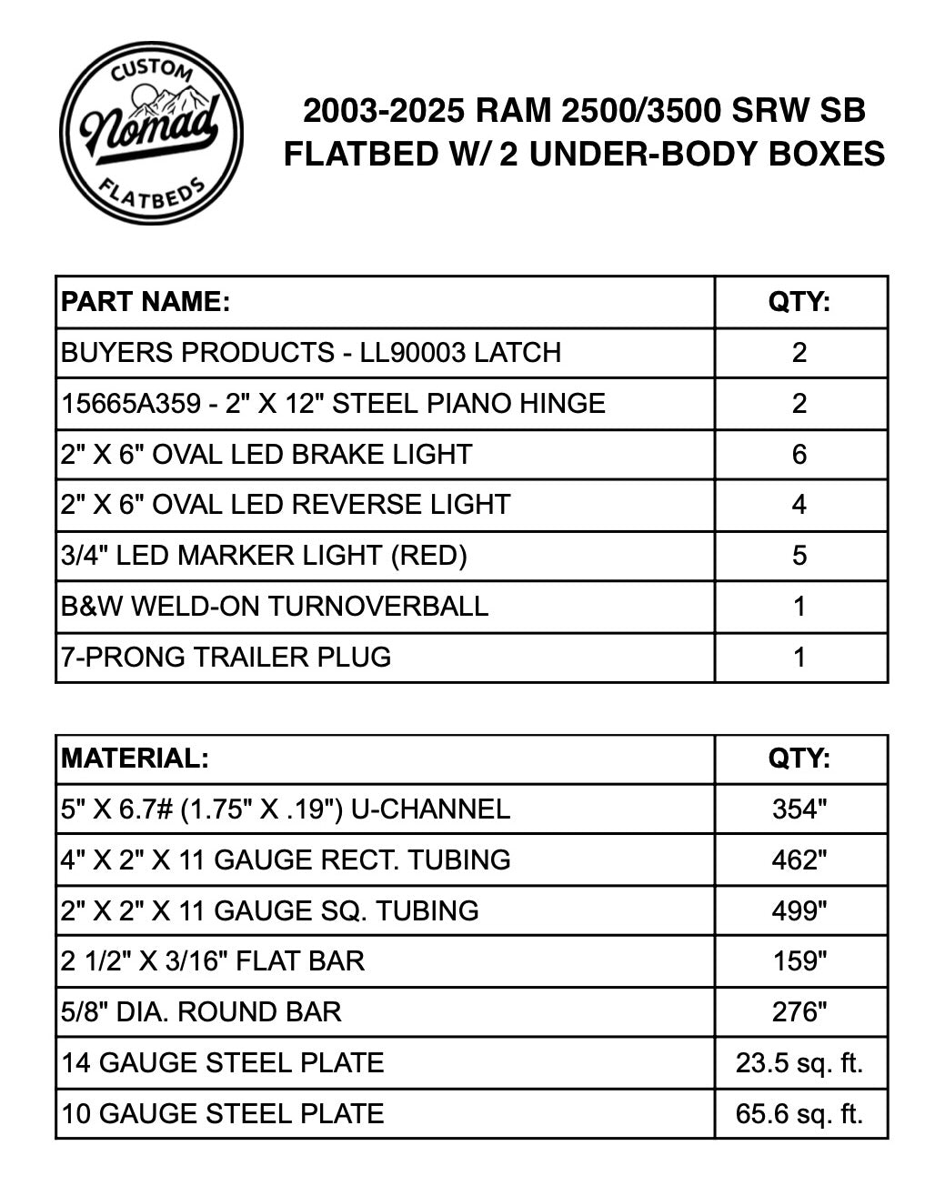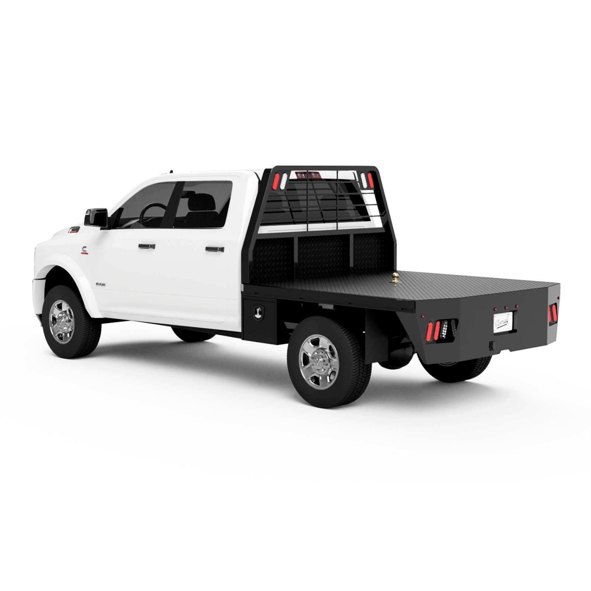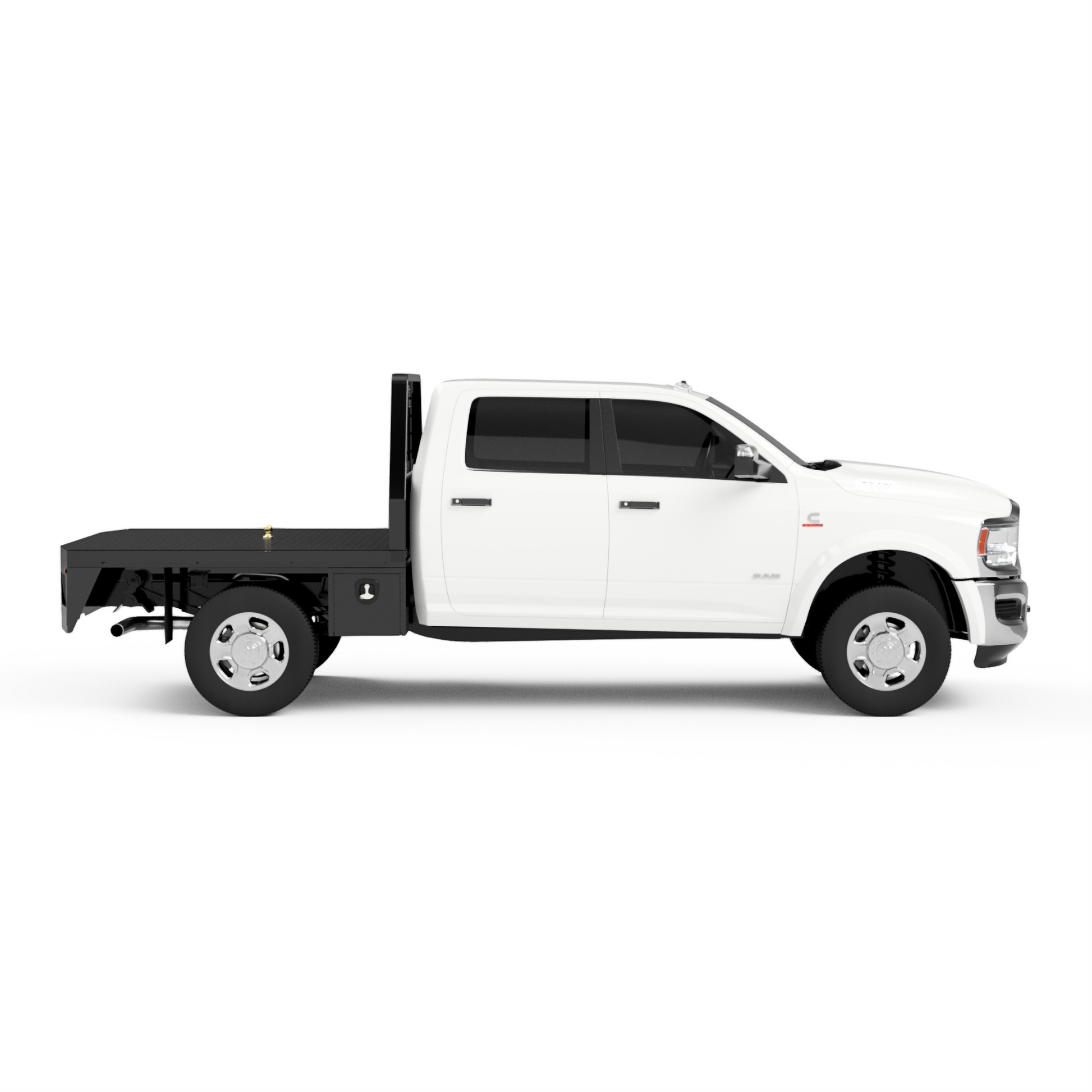 The flatbed shown above is designed to turn any 2003-2025 Ram 2500 or 3500 SRW short-bed pickup into stout and functional work horse. This bed is most notable for it's simple un-skirted construction with the addition of 2 under-body truck boxes. It's primary purpose is to help you maximize the amount of deck space & carrying capacity of your pickup.