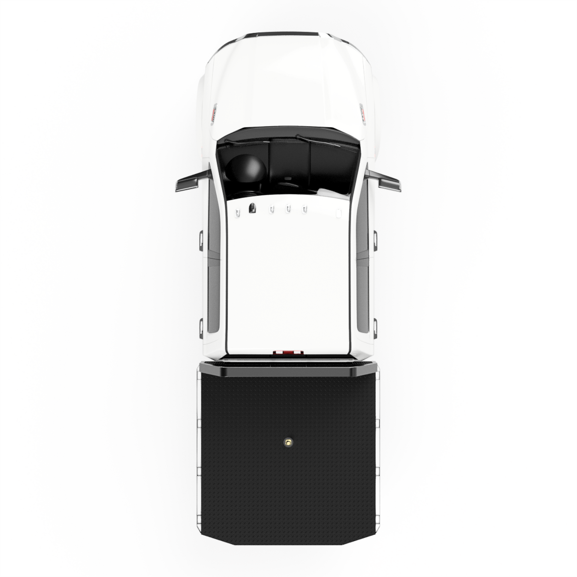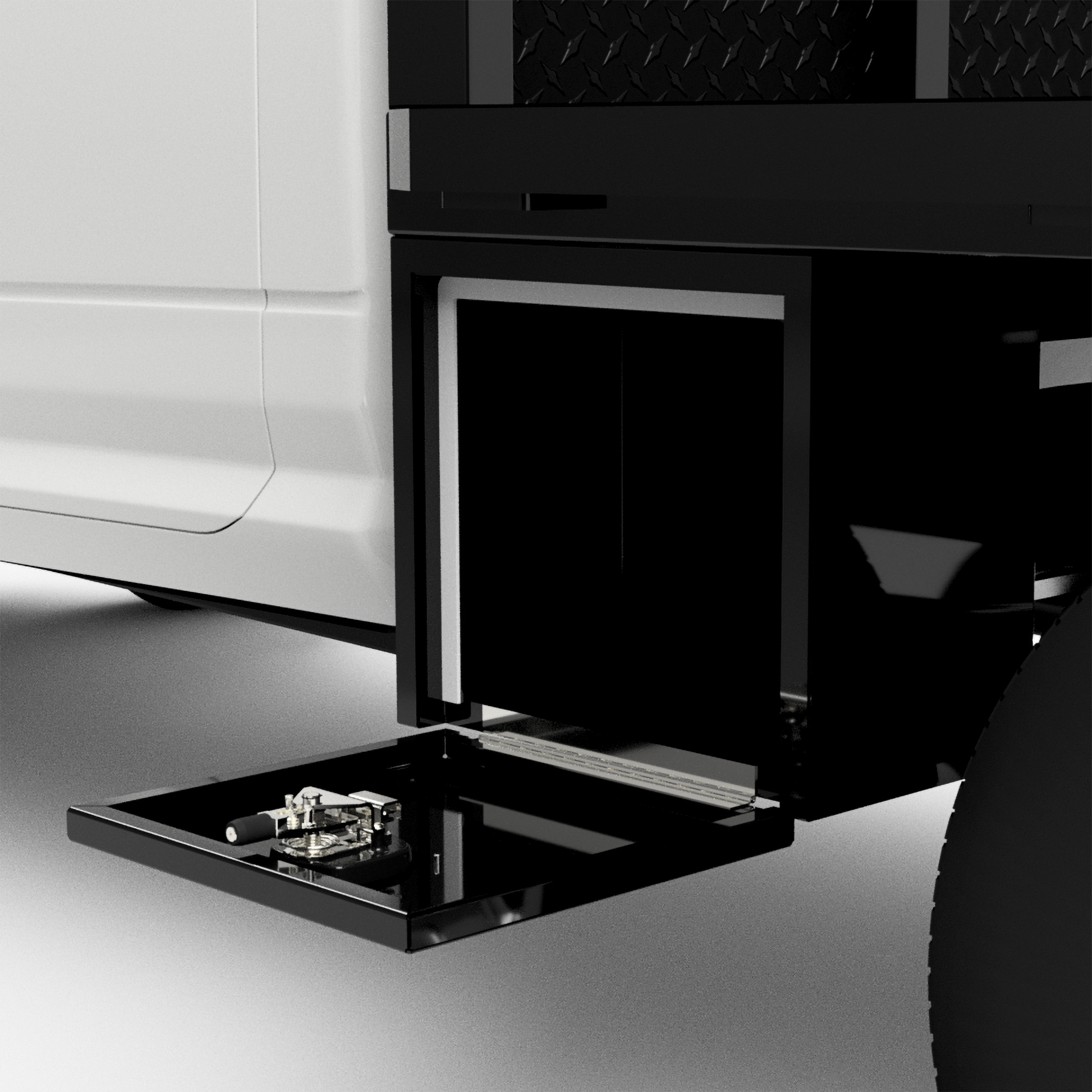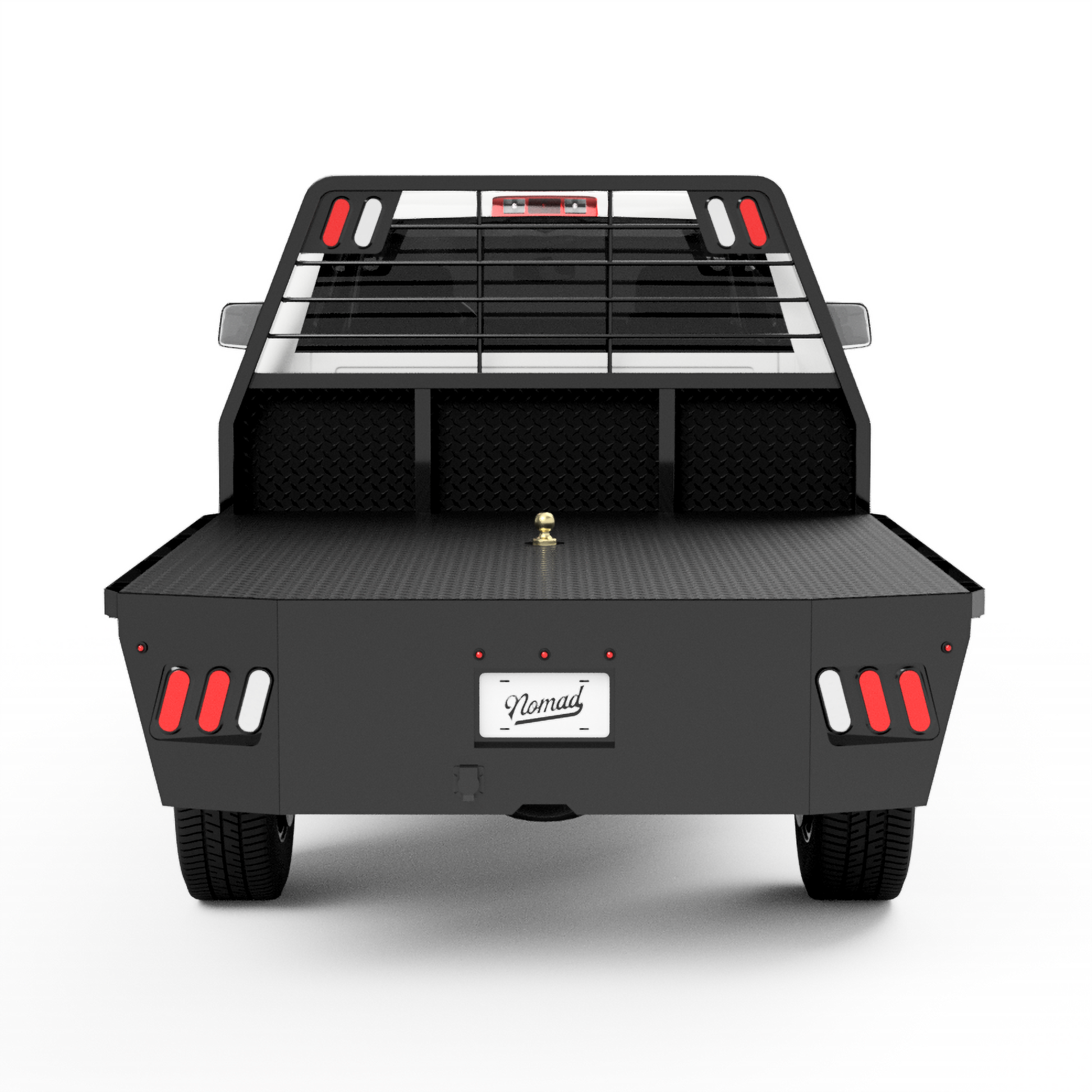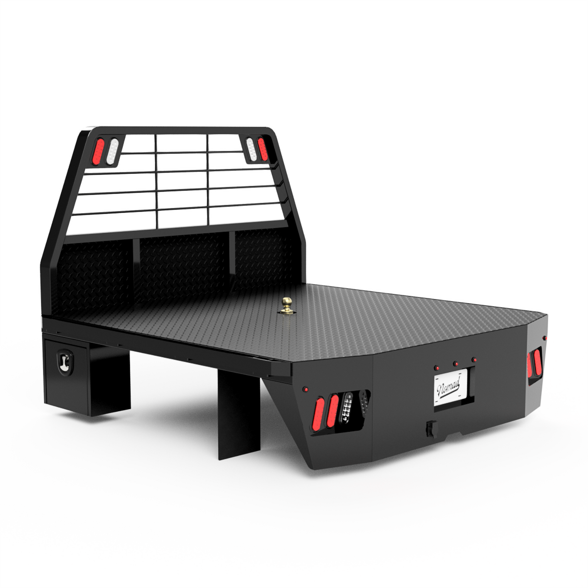 From the back of the cab-forward, this bed is pretty straight forward. It has a 84"L X 80"W deck, rub rails with stake pockets, a stylish-tapered tail, and 2 under-body boxes (18"L X 10"W X 16"H). The factory rear hitch can still be used with this design.