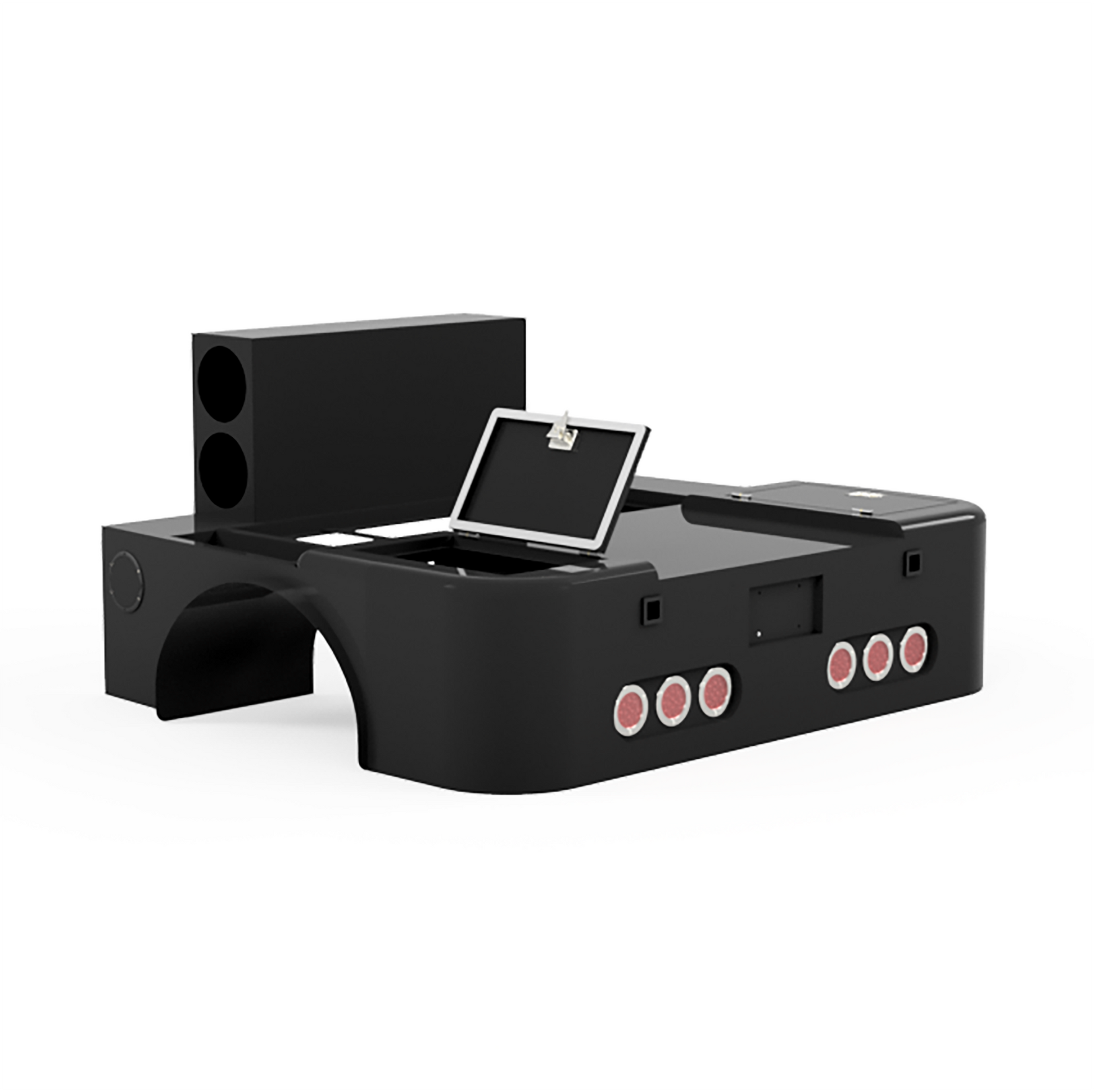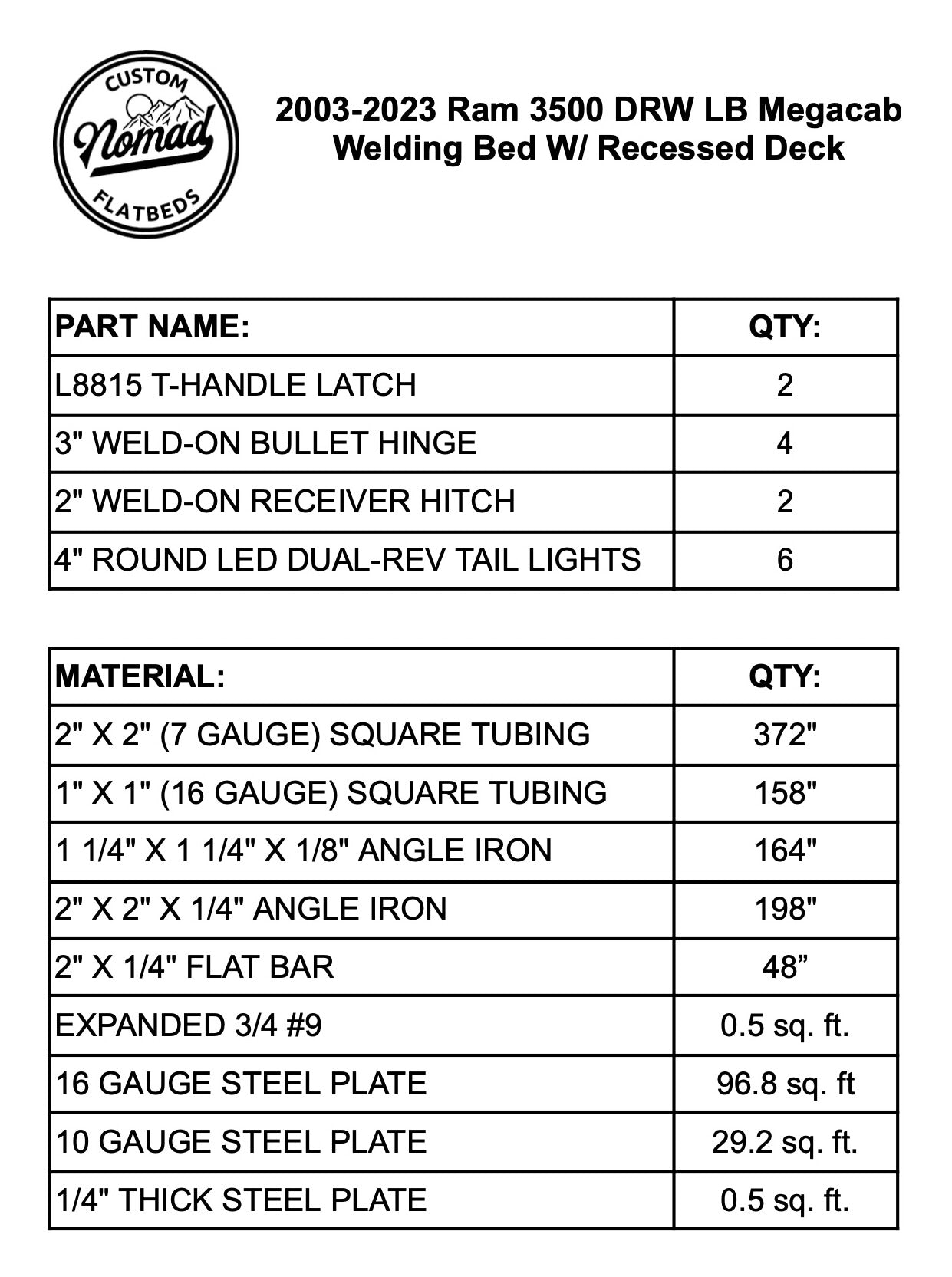 Welding bed w/ a recessed deck designed to fit on 2003-2024 Ram 3500 Mega Cab short-bed trucks with 42" wide frames. Built with a 2" X 2" 7 gauge square tubing frame, 16 gauge plate boxes, fenders, and a 10 gauge tail plate. Overall dimensions: 76" long X 87" wide.