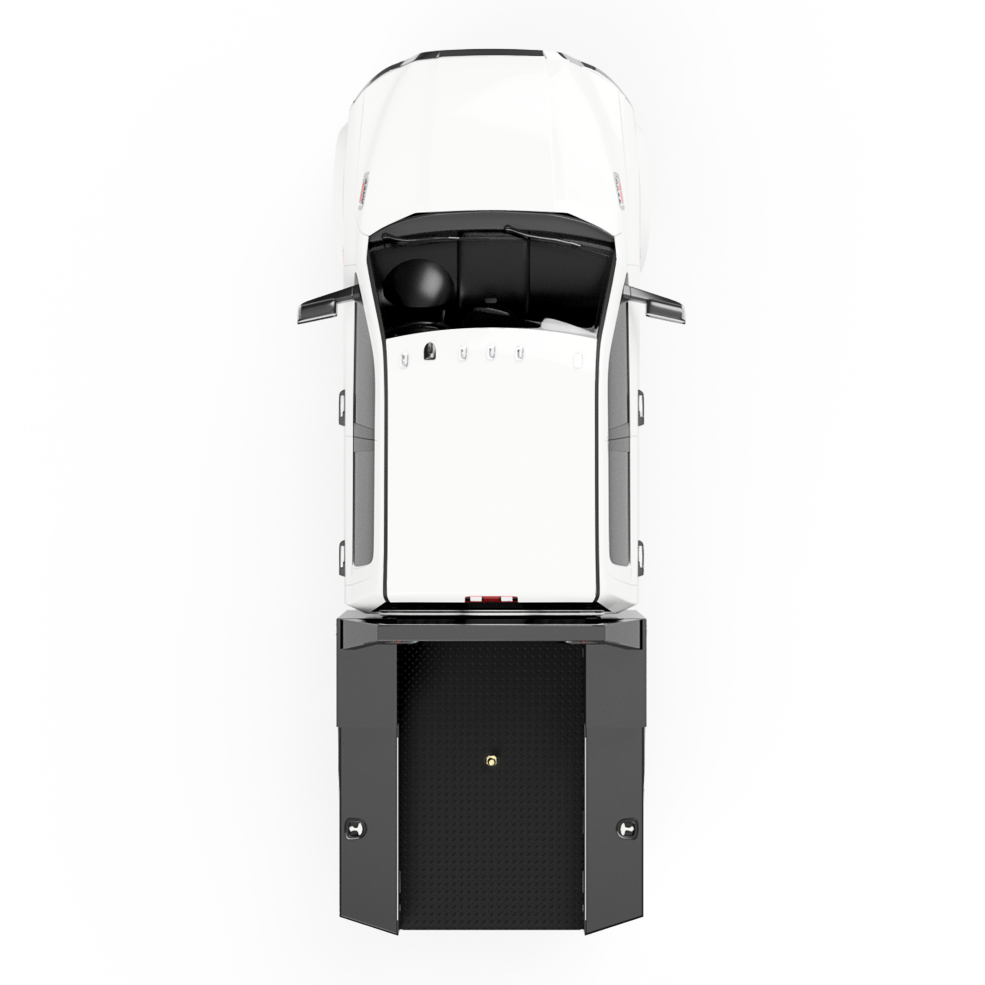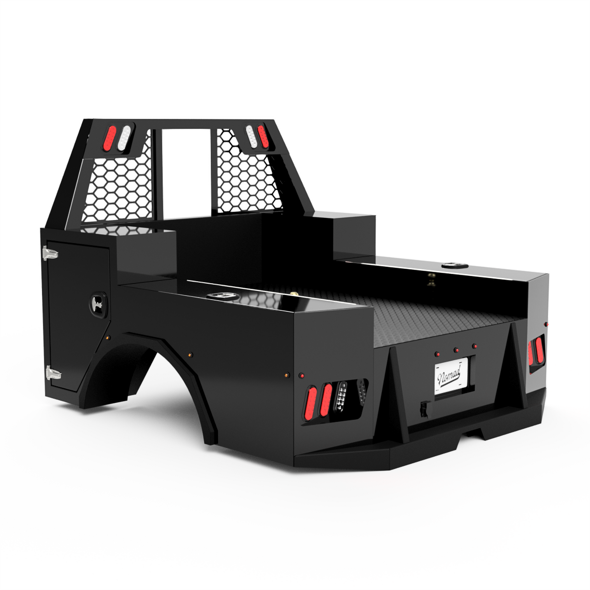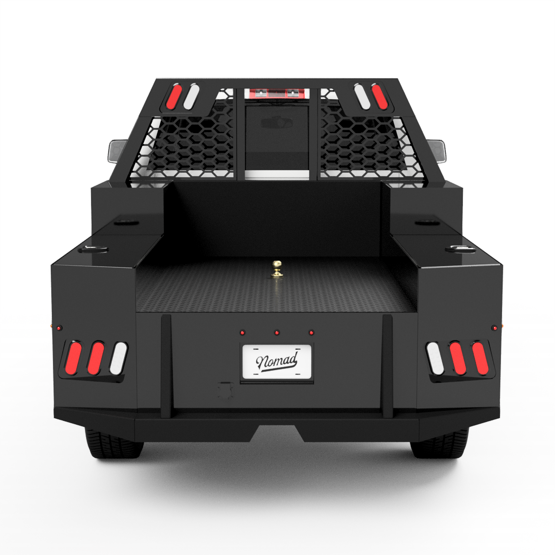 From the back of the cab-forward, this bed features a stylish headache rack and a 84"L X 49"W deck. The front 2 large front boxes are (28"L X 15"W X 38"H) and the rear 2 deck-side boxes are (56"L X 15"W X 27"H). The factory rear hitch can still be used with this design