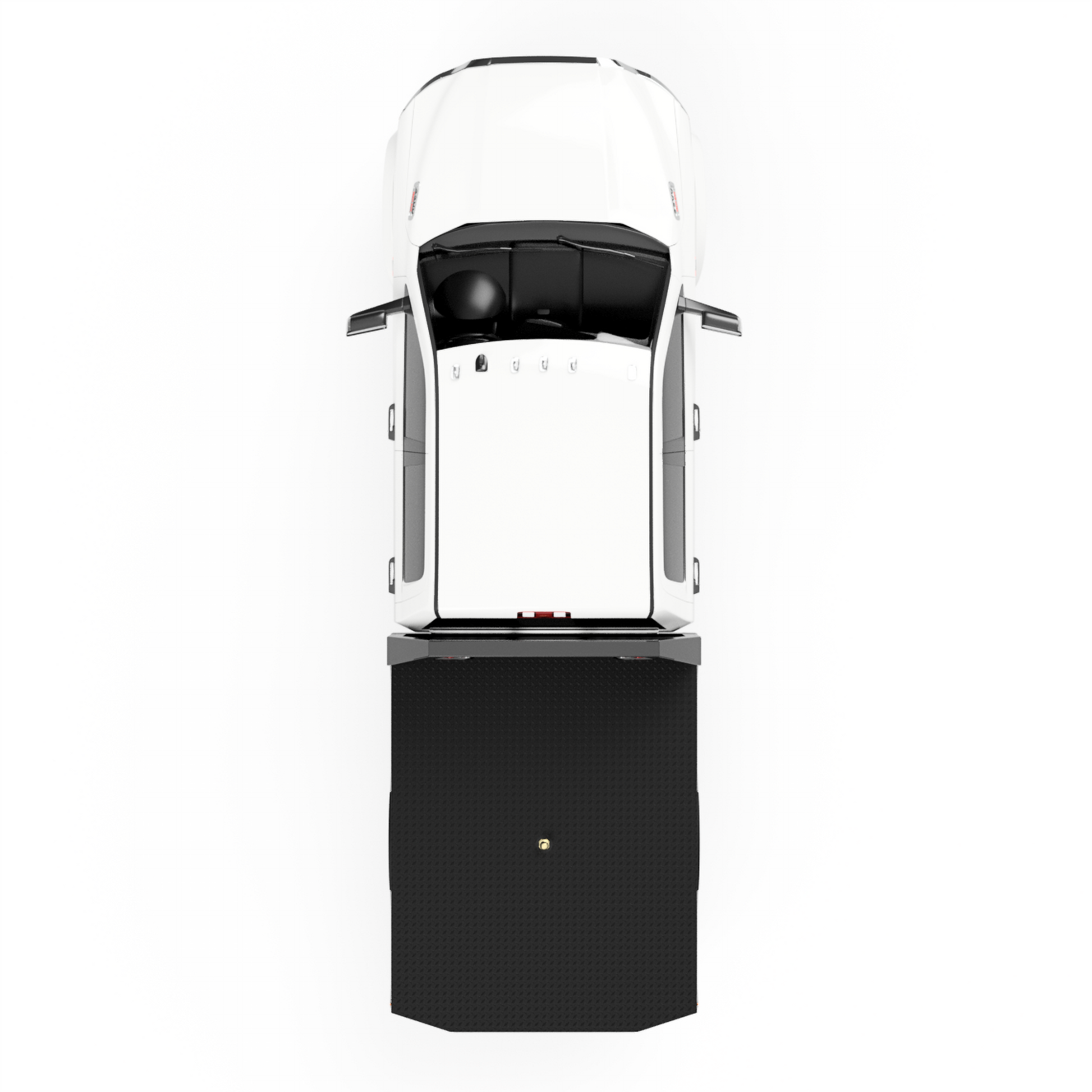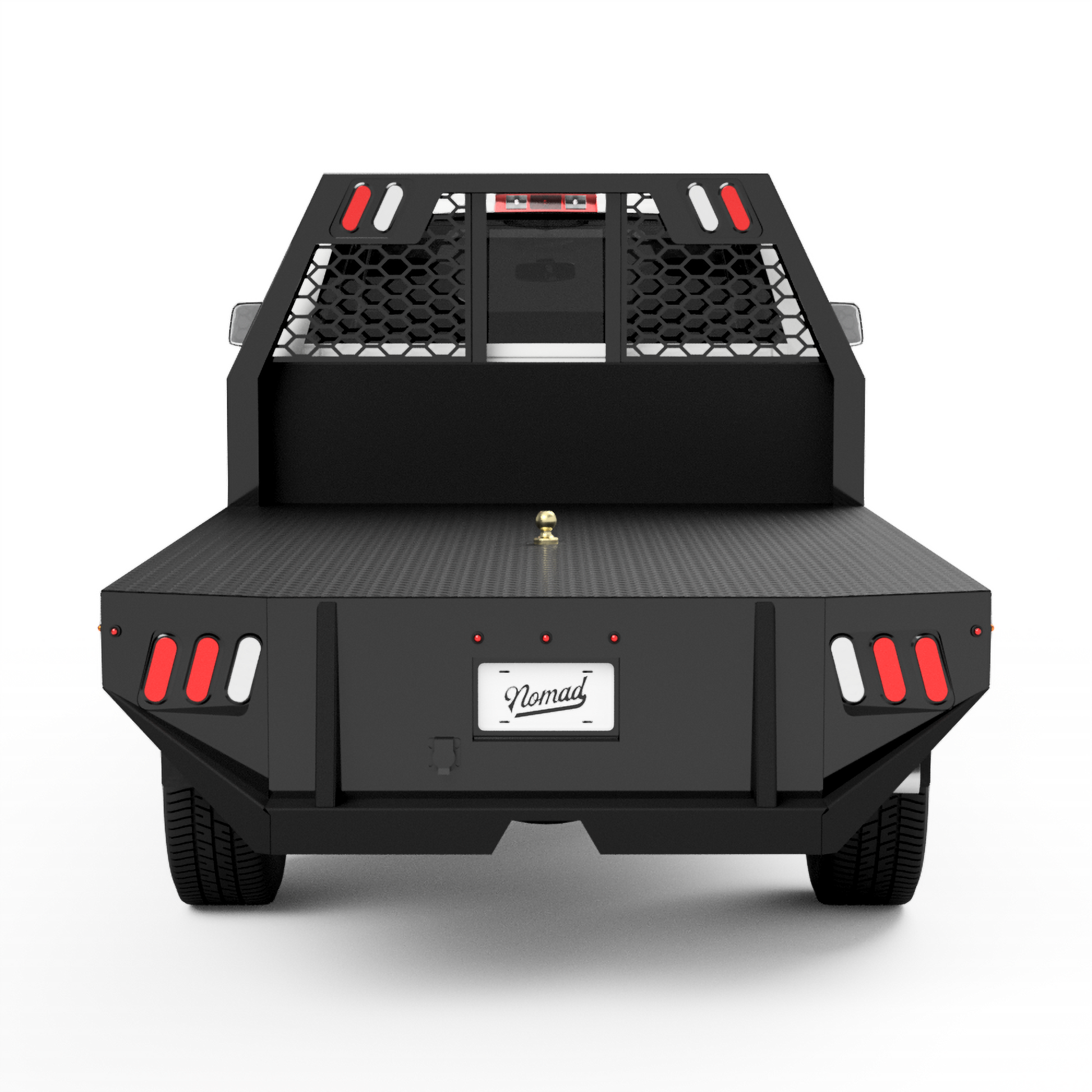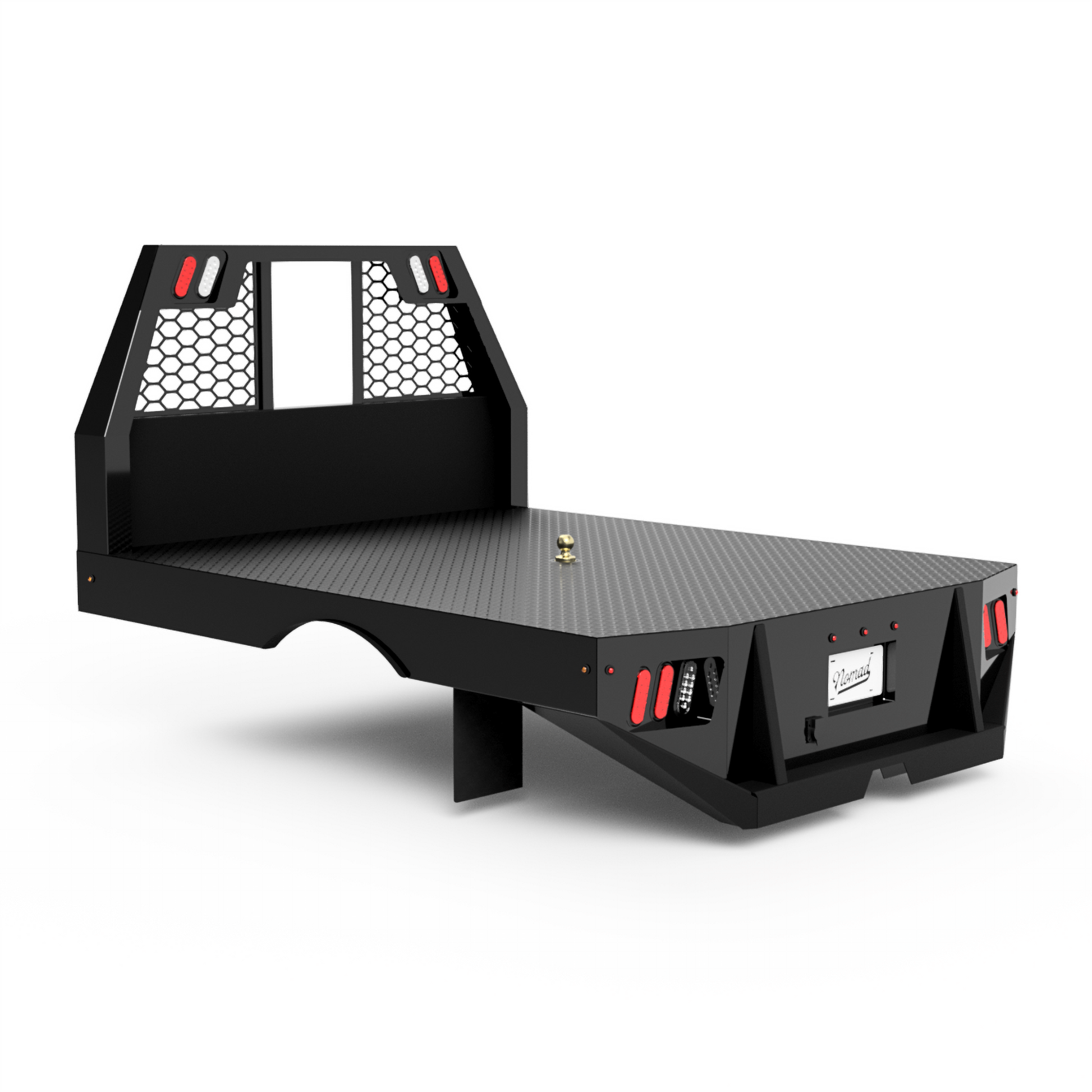 From the back of the cab-forward, this bed is pretty straight forward. It has a 104"L X 80"W deck, half-length side skirts, and a stylish-tapered tail. The factory rear hitch can still be used with this design.
