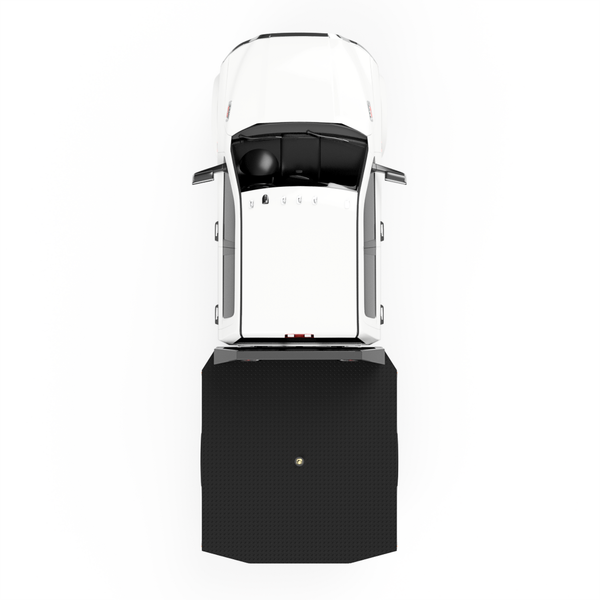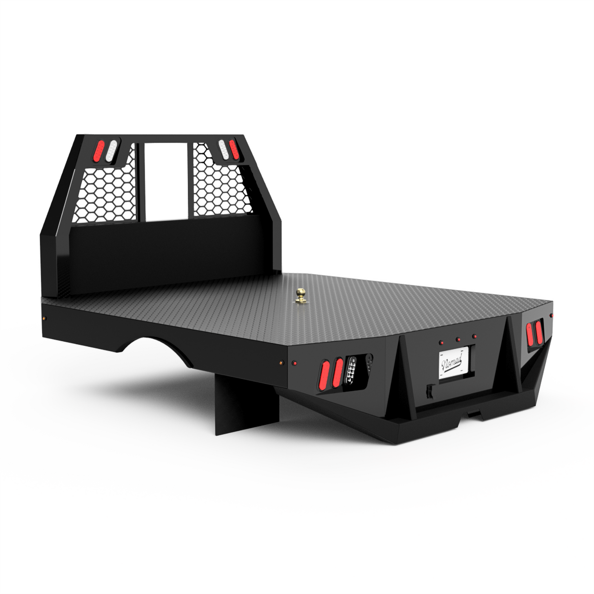 From the back of the cab-forward, this bed is pretty straight forward. It has a 104"L X 94"W deck, half-length side skirts, and a stylish-tapered tail. The factory rear hitch can still be used with this design.