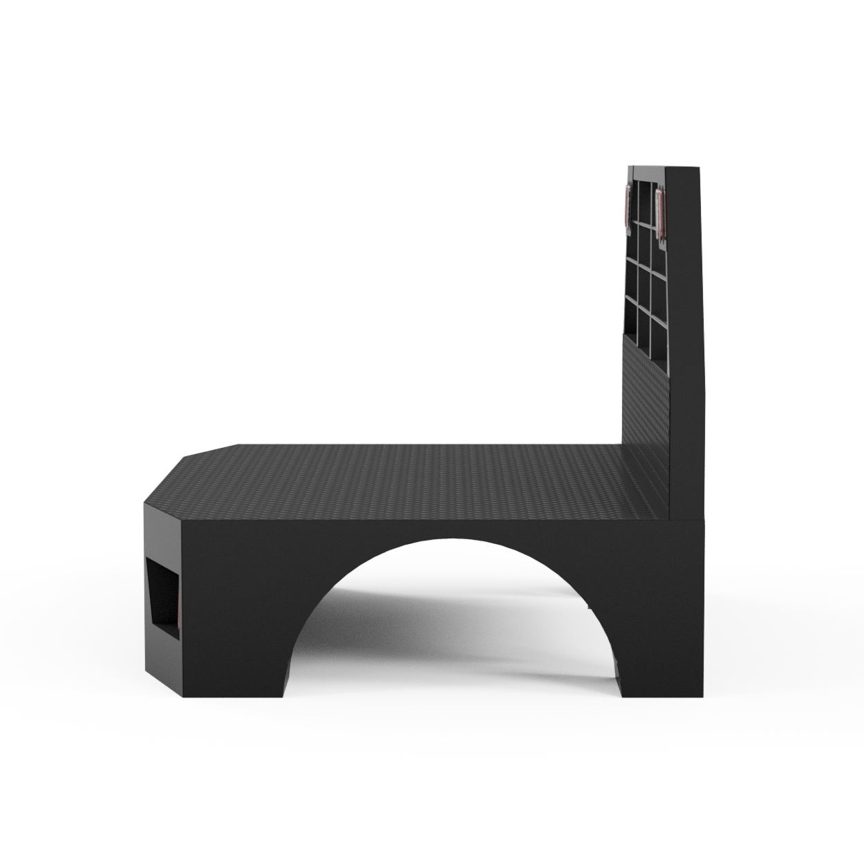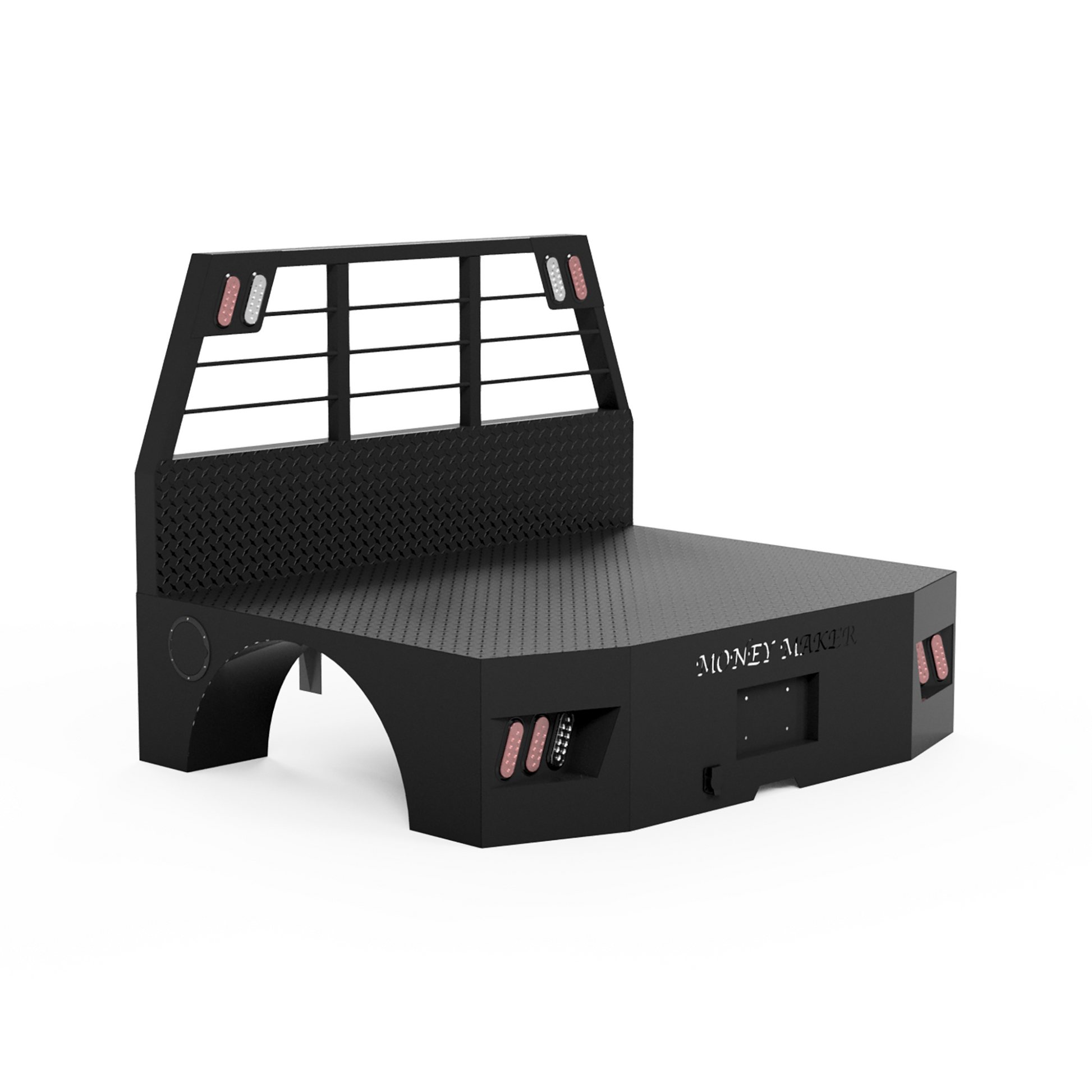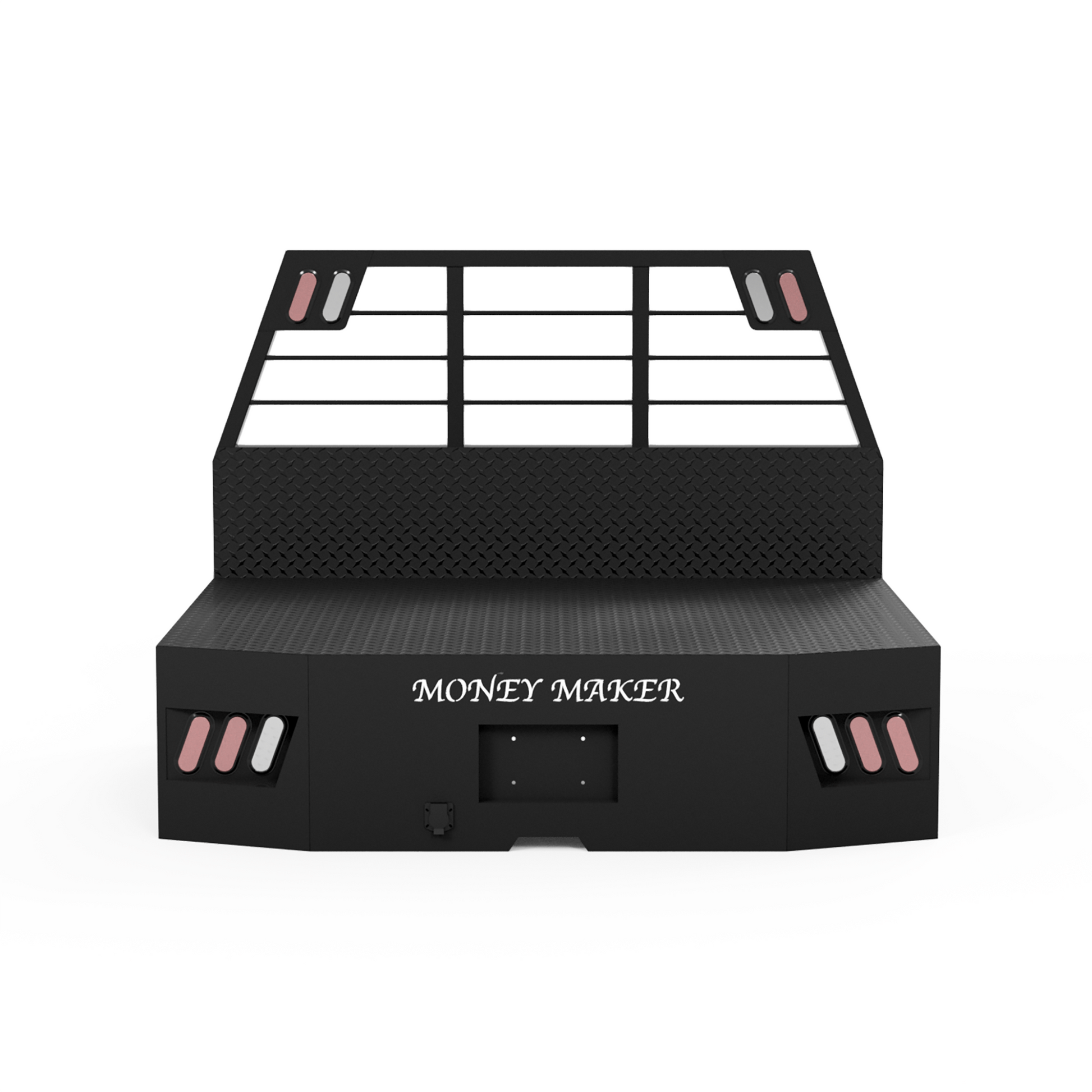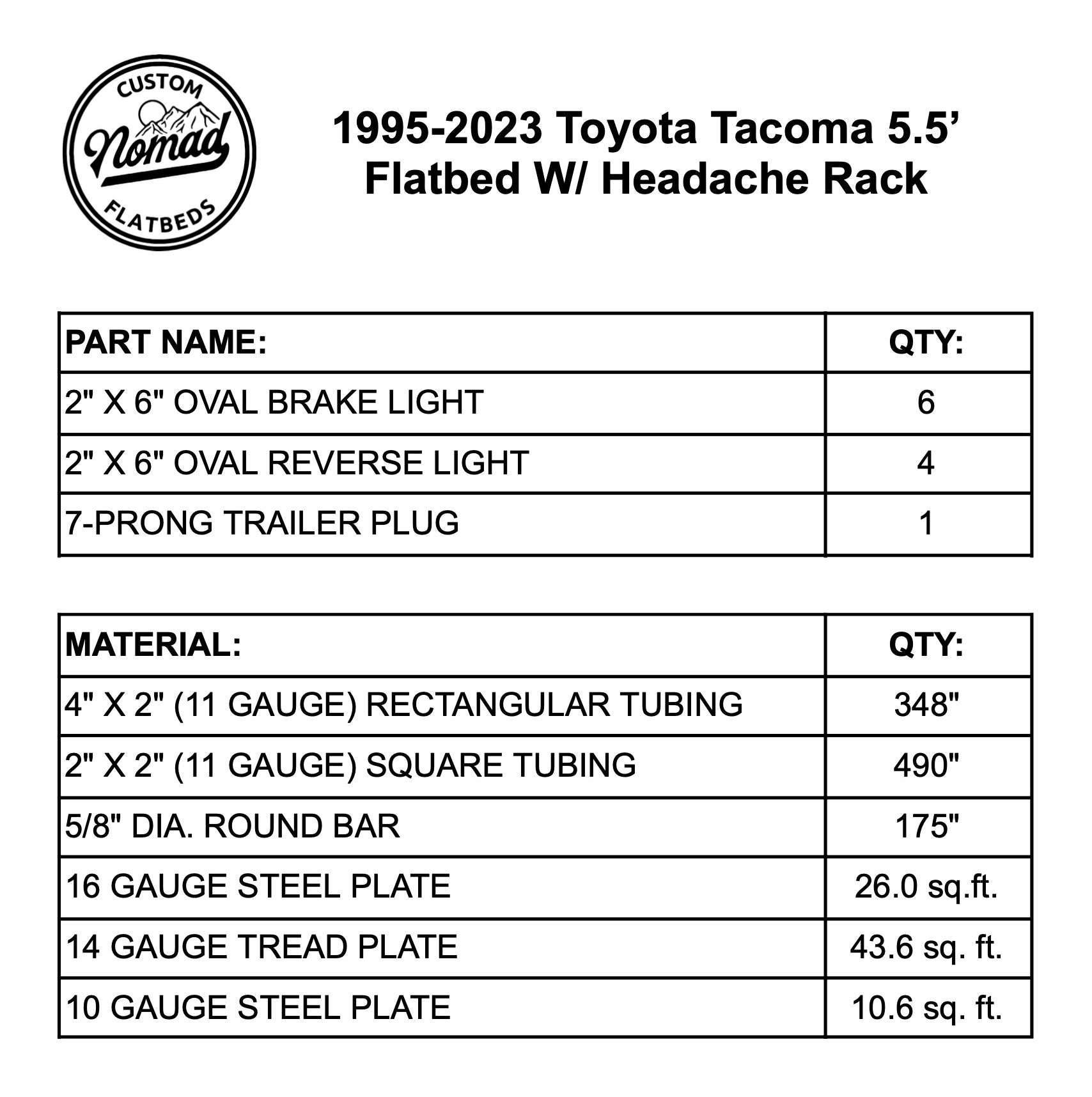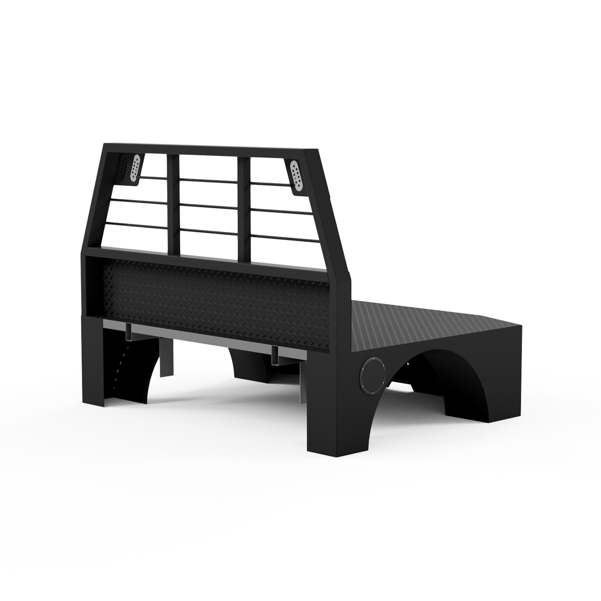 Skirted flatbed w/ headache rack designed to fit on 2007-2021 Toyota Tundra short-bed trucks with 43 1/2" wide frames. Built with a 4" X 2" 11 gauge rectangular tubing frame, 2" X 2" 11 gauge square tubing sub-frame, 16 gauge plate fenders, 14 gauge tread plate deck, and 10 gauge plate tail. Overall dimensions: 64" long X 80" wide.