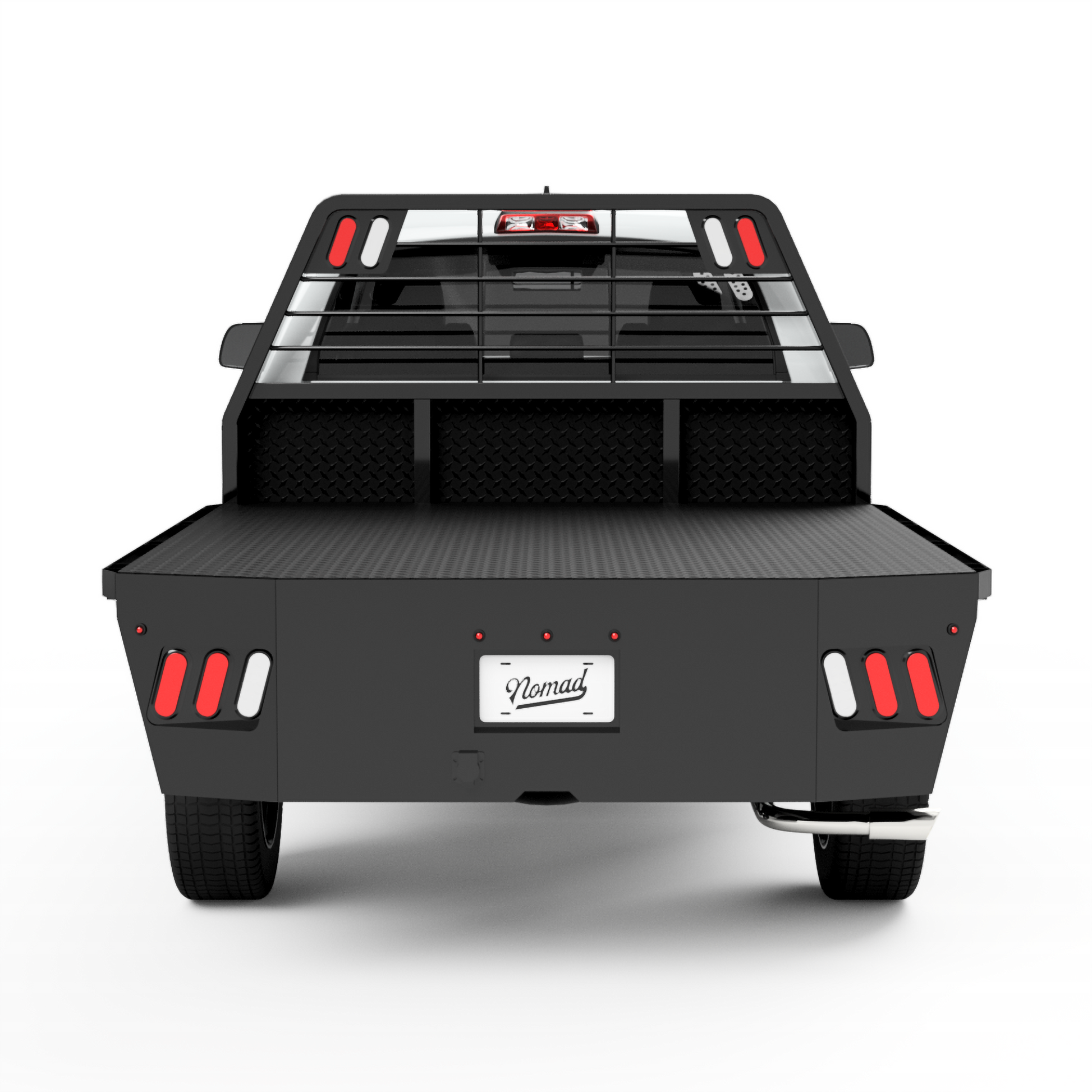 From the back of the cab-forward, this bed is pretty straight forward. It has a 84"L X 78"W deck, rub rails with stake pockets, and a stylish-tapered tail. The factory rear hitch can still be used with this design.