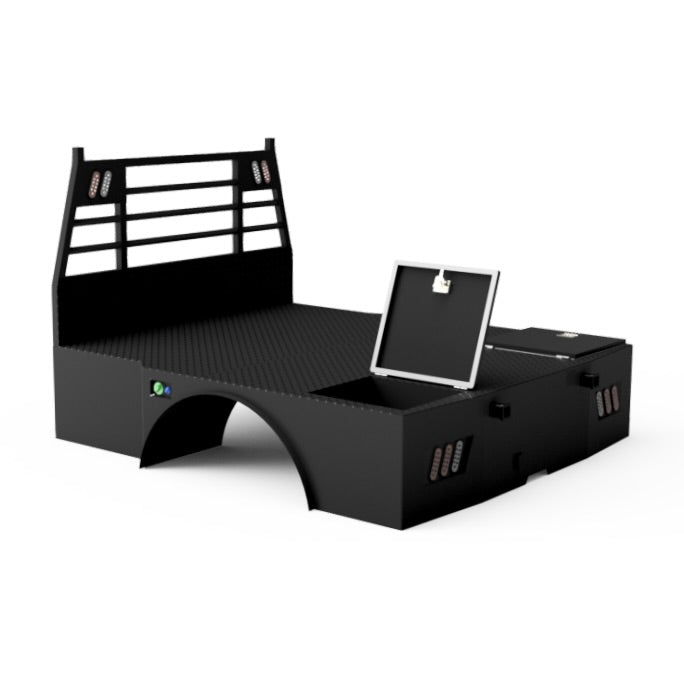 Welding bed w/ headache rack designed to fit on 1999-2024 F-350/F-450 DRW long-bed trucks with 38" wide frames. Built with a 4" X 2" 7 gauge rectangular tubing frame, 2" X 2" 7 gauge square tubing sub-frame, 16 gauge plate boxes & fenders, and 7 gauge plate tail. Overall Dimensions: 100" long X 88" wide.