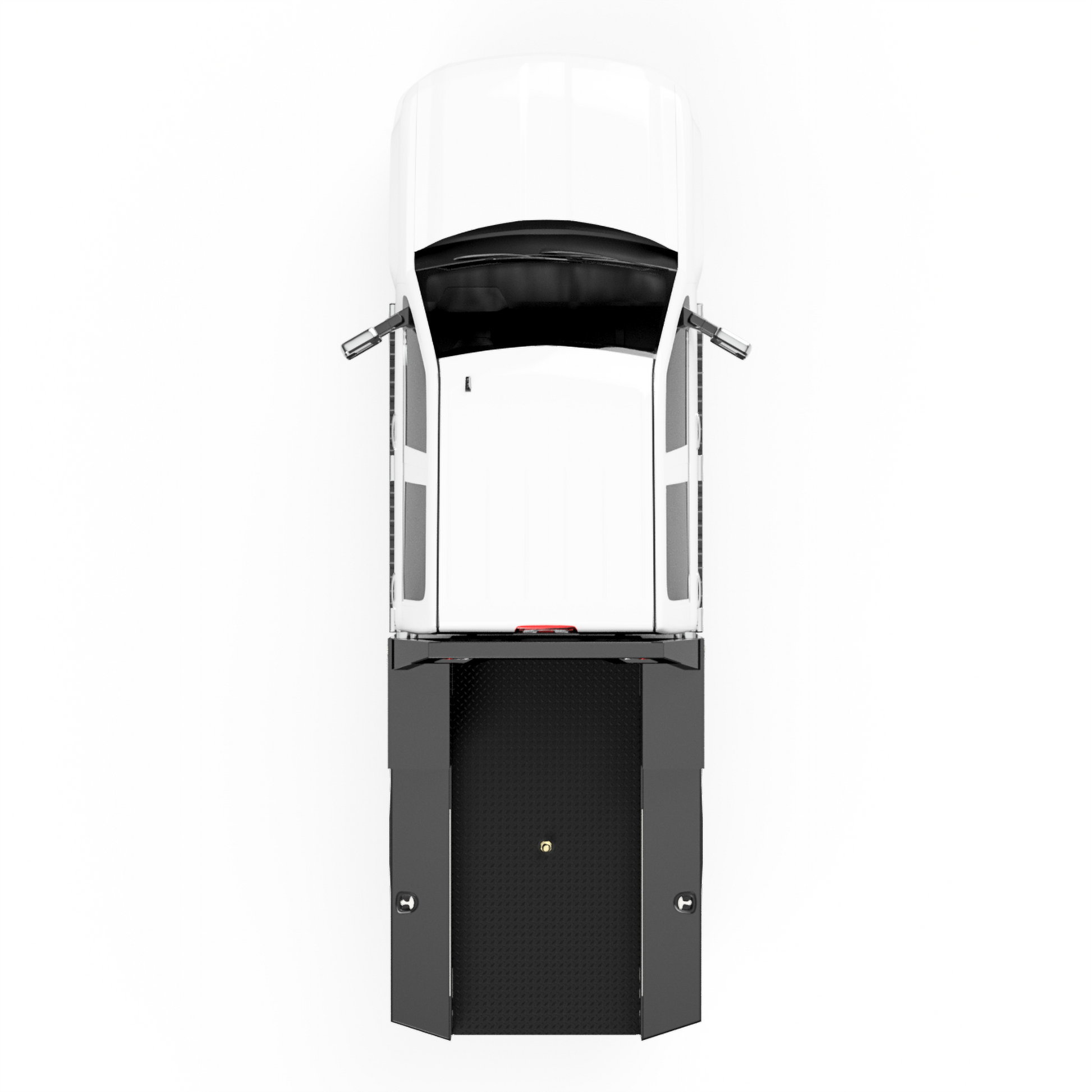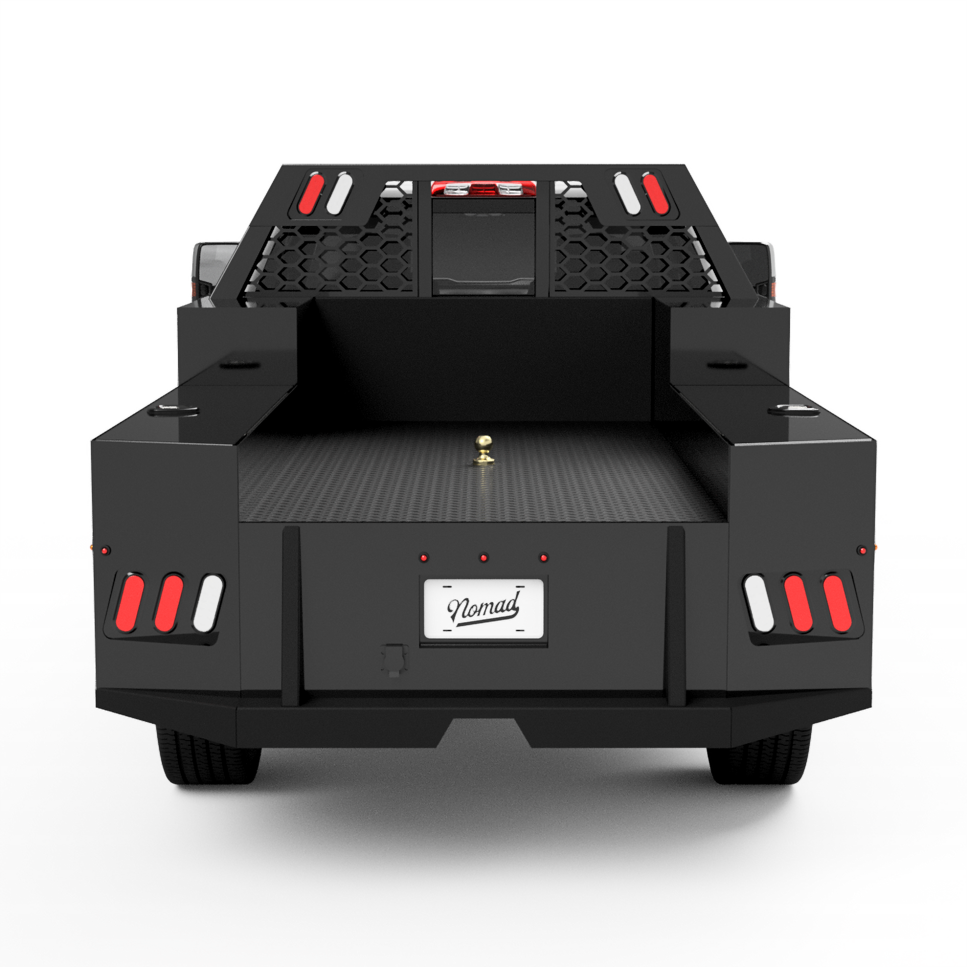 From the back of the cab-forward, this bed features a stylish headache rack and a 104"L X 80"W deck. The front 2 large front boxes are (33"L X 15"W X 38"H) and the rear 2 deck-side boxes are (71"L X 15"W X 27"H). The factory rear hitch can still be used with this design.