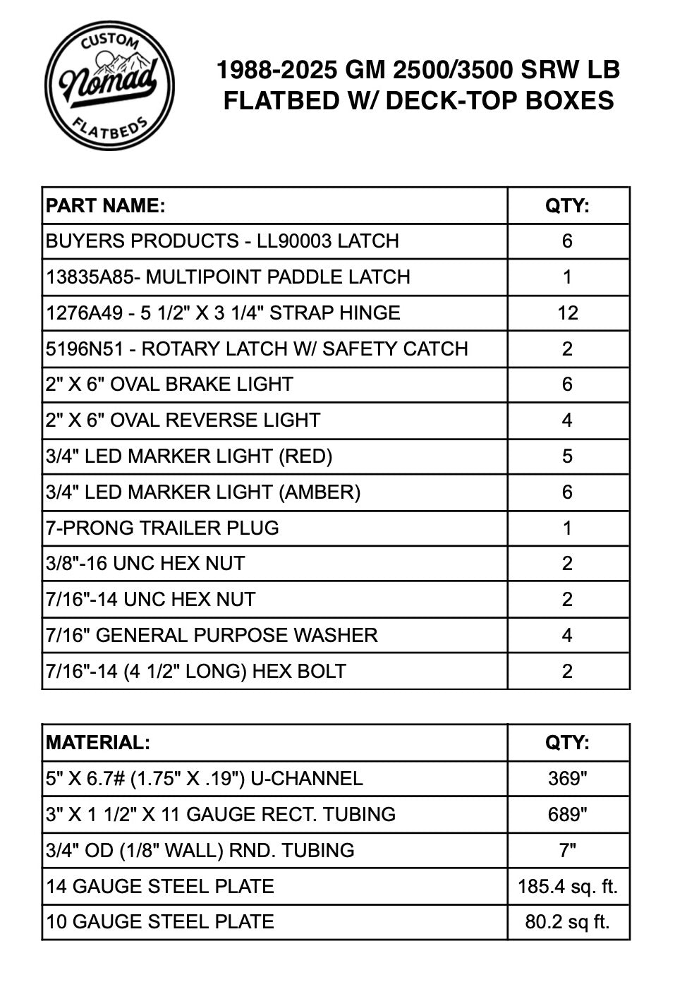 The flatbed shown above is designed to turn any 1988-2025 Chevy/GMC 2500 or 3500 SRW long-bed pickup into stout and functional work horse. This bed is most notable for it's conventional utility bed build with a sleek tapered tail & headache rack designs. It's primary purpose is to help you maximize the amount of onboard storage capabilities of your pickup while maintaining plenty of usable deck space.