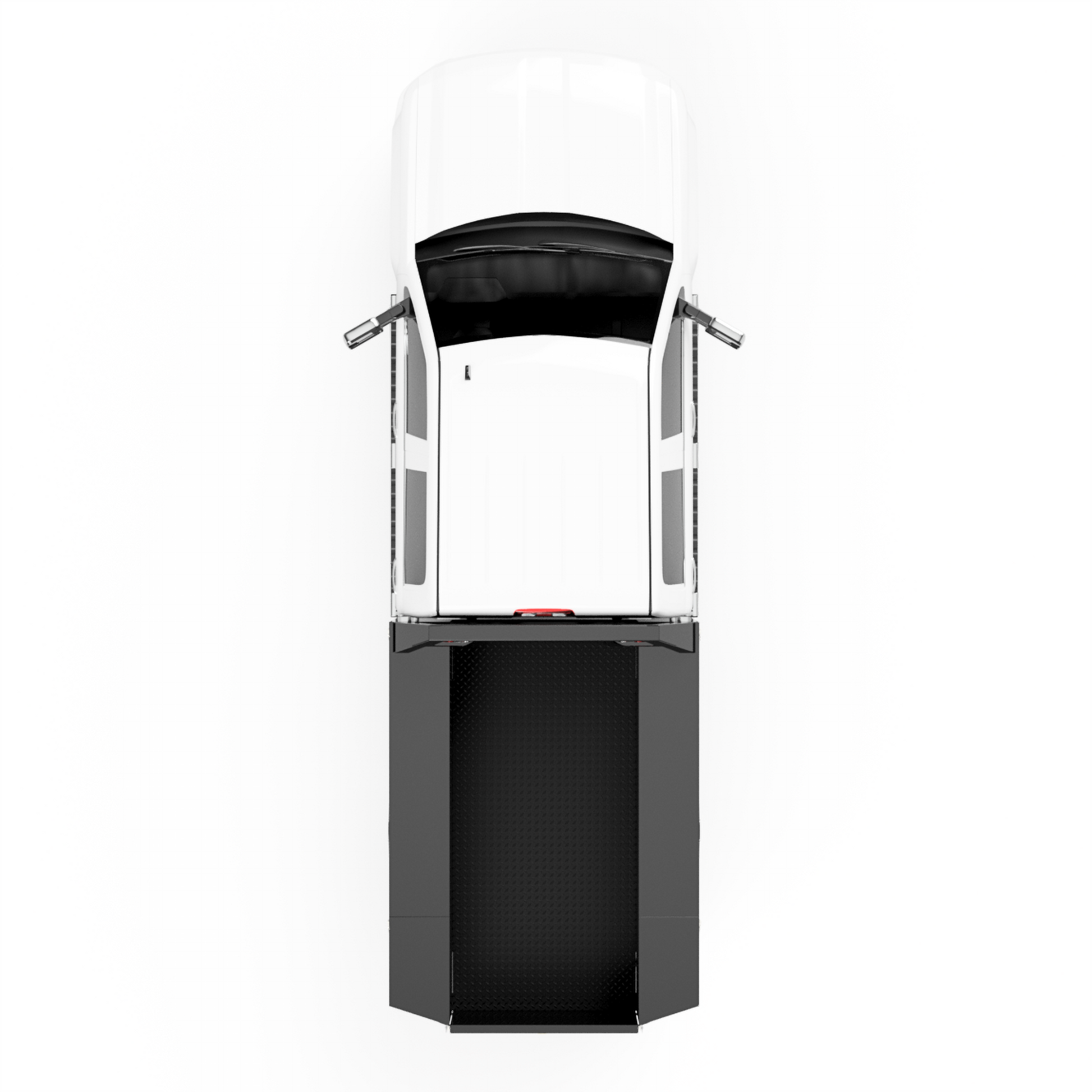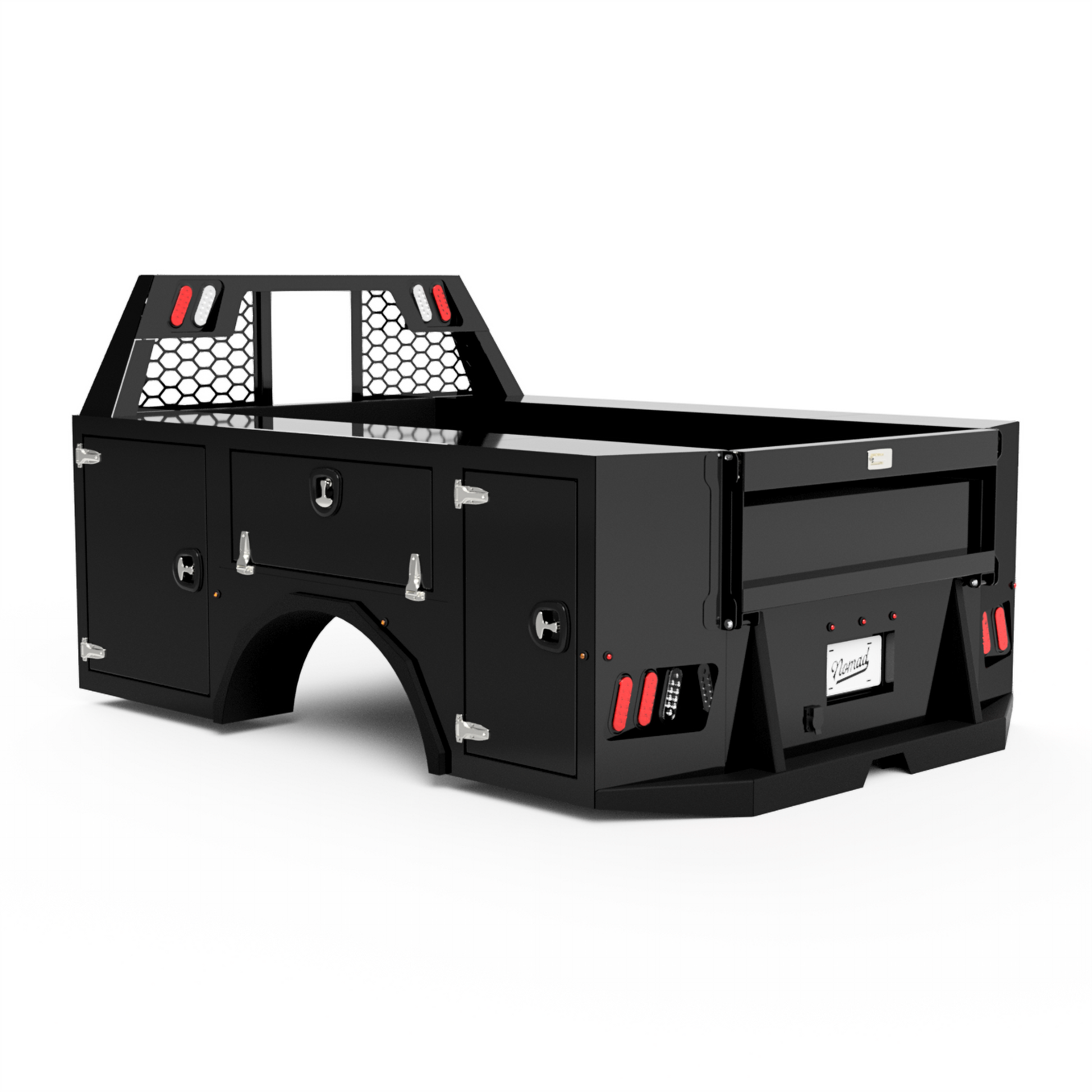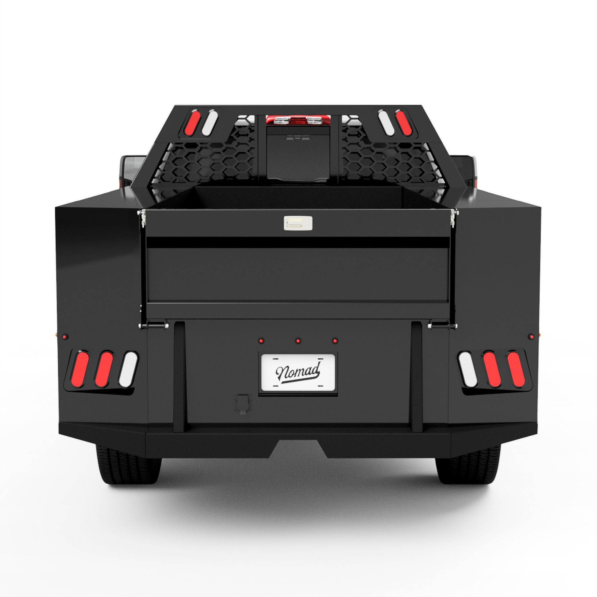From the back of the cab-forward, this bed features a stylish headache rack and a 104"L X 80"W deck. The front 2 large front boxes are (33"L X 15"W X 38"H) and the 2 deck-top boxes are (43"L X 15"W X 18"H). In addition to that, this bed also features rear 2 large front boxes (28"L X 15"W X 38"H). The factory rear hitch can still be used with this design.